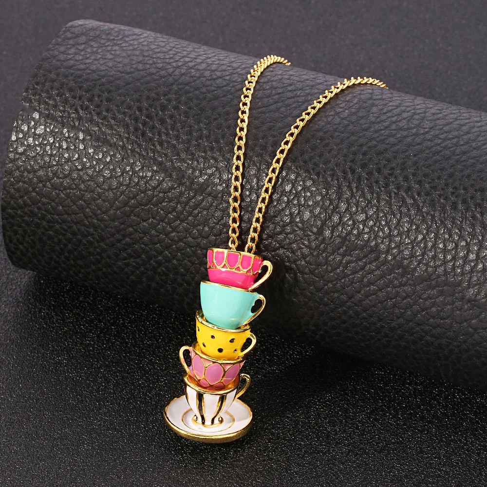 2021 Enamel Tea Cup Pendant Necklace for Women Aesthetic Colourful Sweater Long Neck Chain One Piece Accessories Jewelry Gift