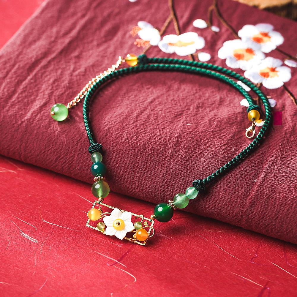 2021 Female Accessories Chinese Style Chokers Necklace Woman Jewelery White Shell Flower Green Yellow Stone Beads Rope DL-195011