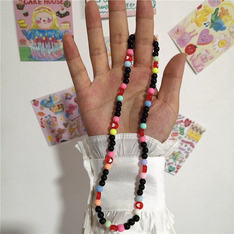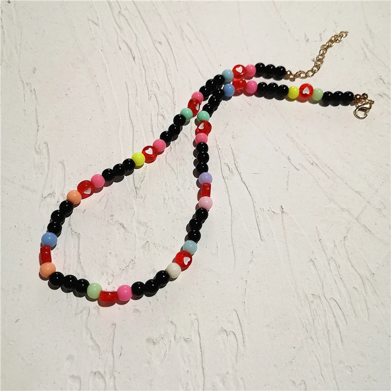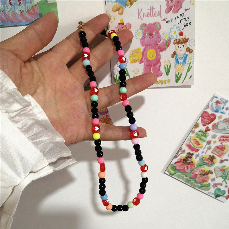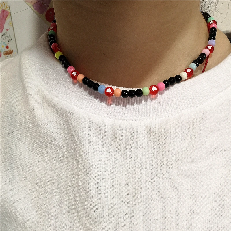 2021 Goth Hip Hop Harajuku Acrylic Red Heart Love Black Beaded Choker Necklace For Couple Trendy Jewelry Accessories