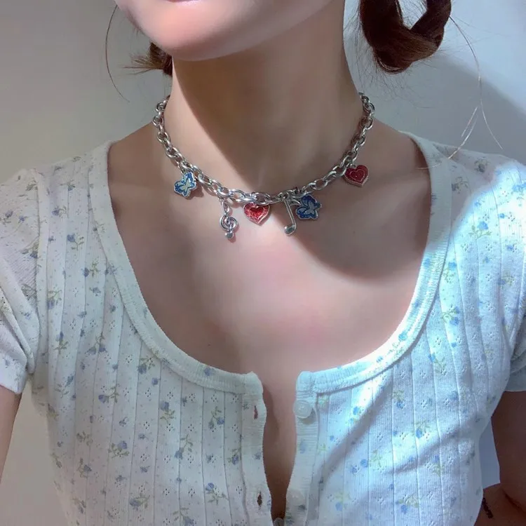 2021 Korea Punk Vintage Butterfly Musical Note Clavicle Chain Necklace for Women Love Heart Temperament Y2K Pendant Necklaces