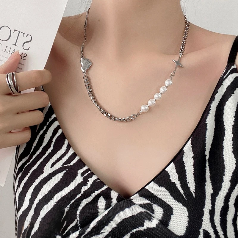 2021 Trend Personality Hip Hop Multilayer Necklace for Women Metal Pearl Couple Pendant Silver Color Chain Necklace Jewelry