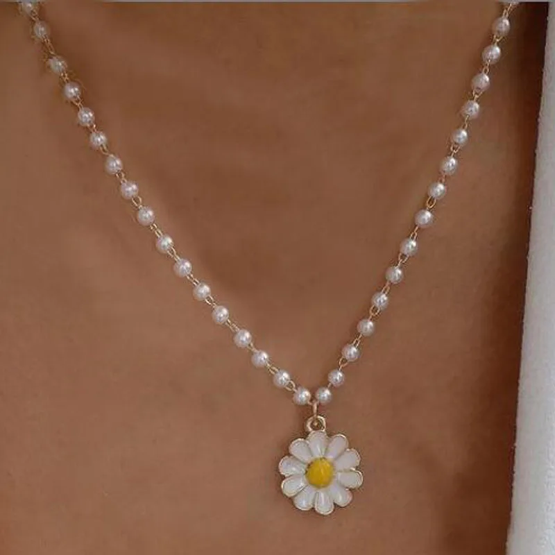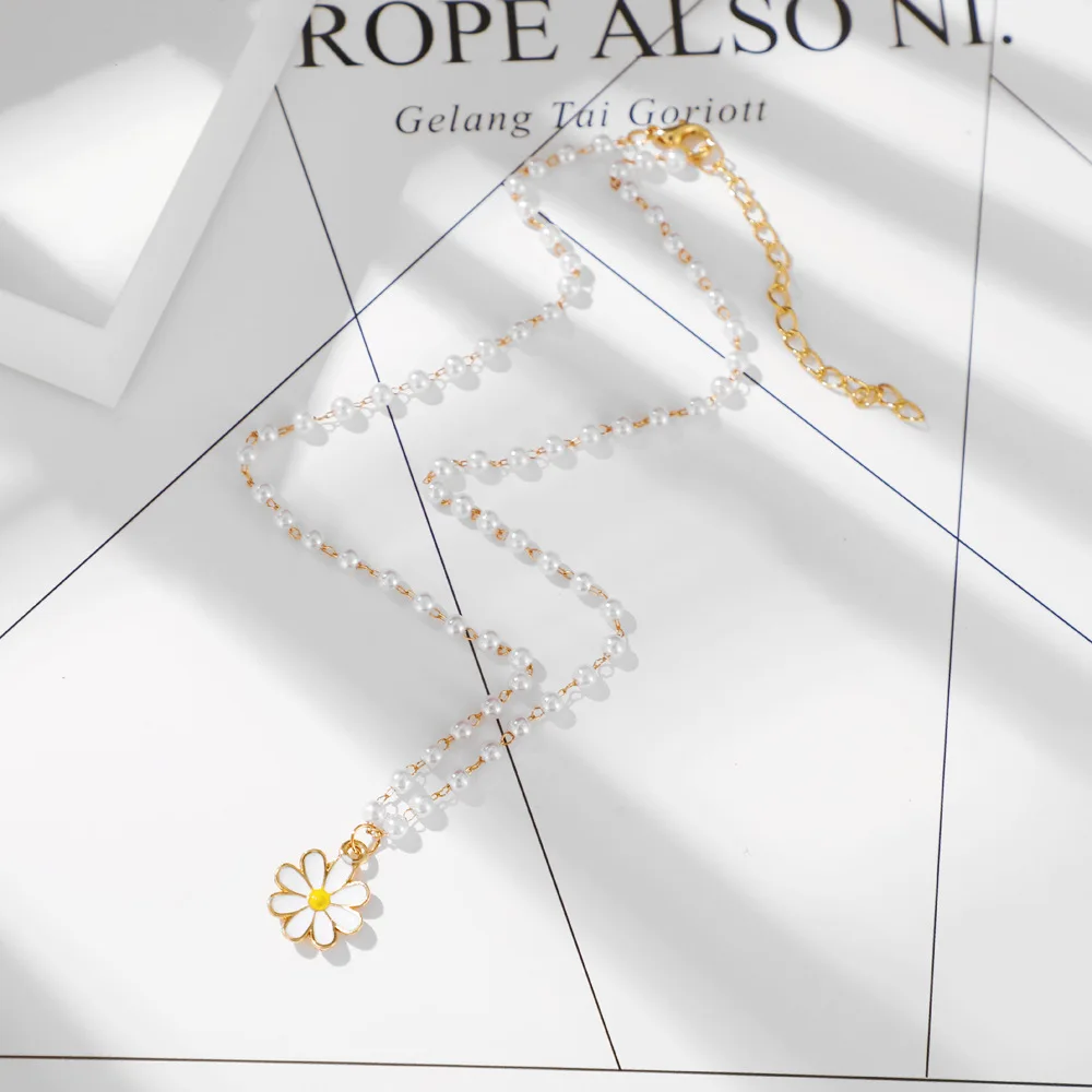 2021Trend Elegant Jewelry White Imitation Pearl Chain Oil Flower Pendant Necklace Unquie Women Necklace чокер