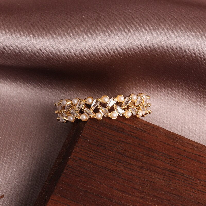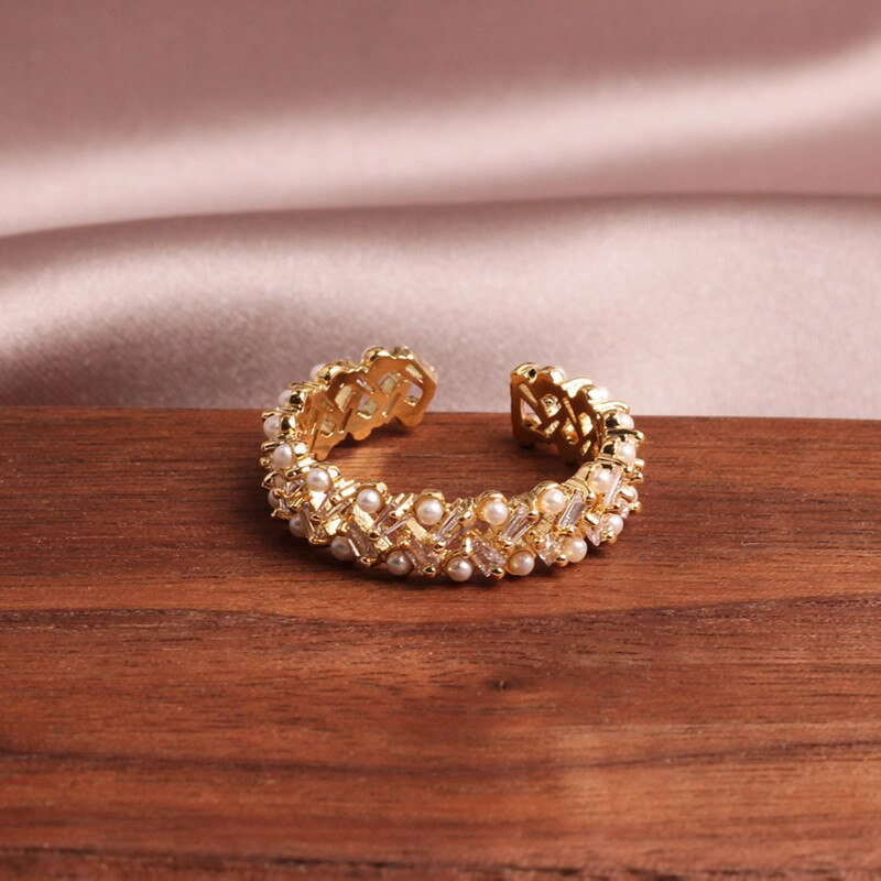2022 Korean design jewelry exquisite copper inlaid zircon hollow pearl simple round opening female ring