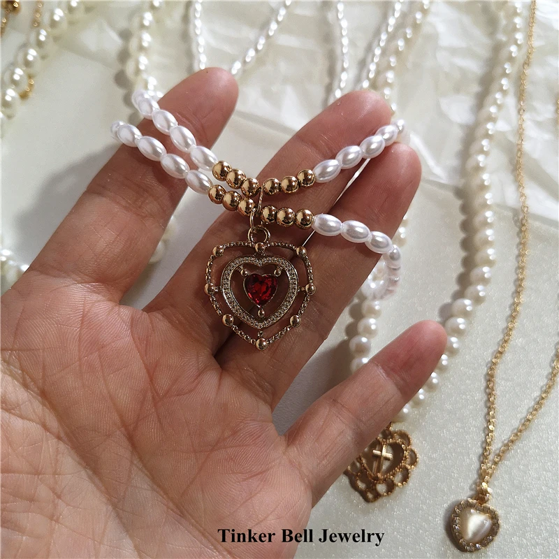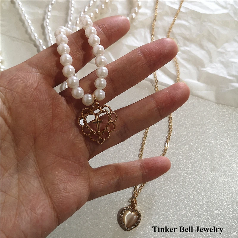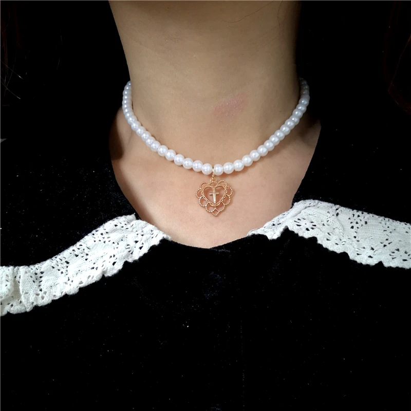 2022 Kpop Vintage Baroque Aesthetic Hollow Out Love Heart Pendant Zircon Pearl Chain Choker Necklace For Women Bff Party Jewelry