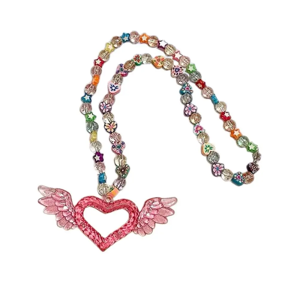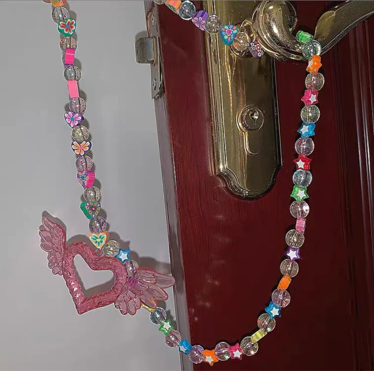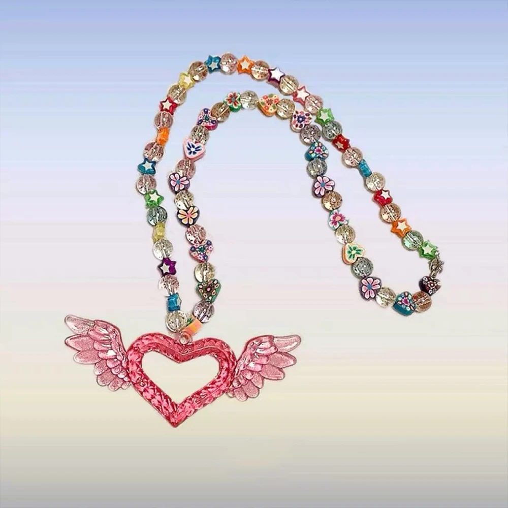 2022 Trend Acrylic Pink Heart Wing Pendant Painted Harajuku Flash Bead Necklace Unusual Goth Neck Chain 90s Y2k Jewelry Gift