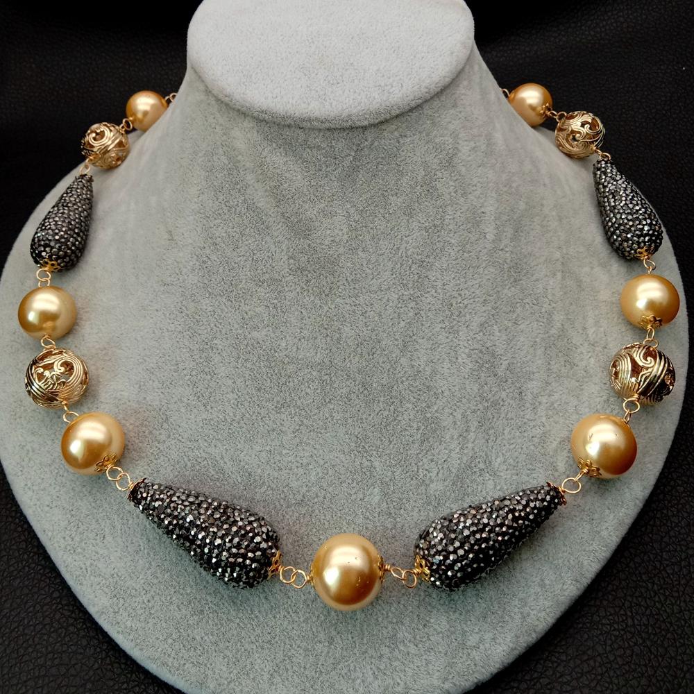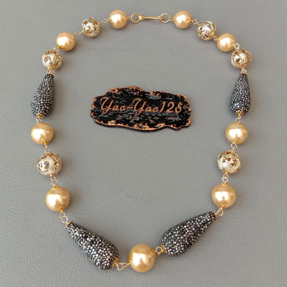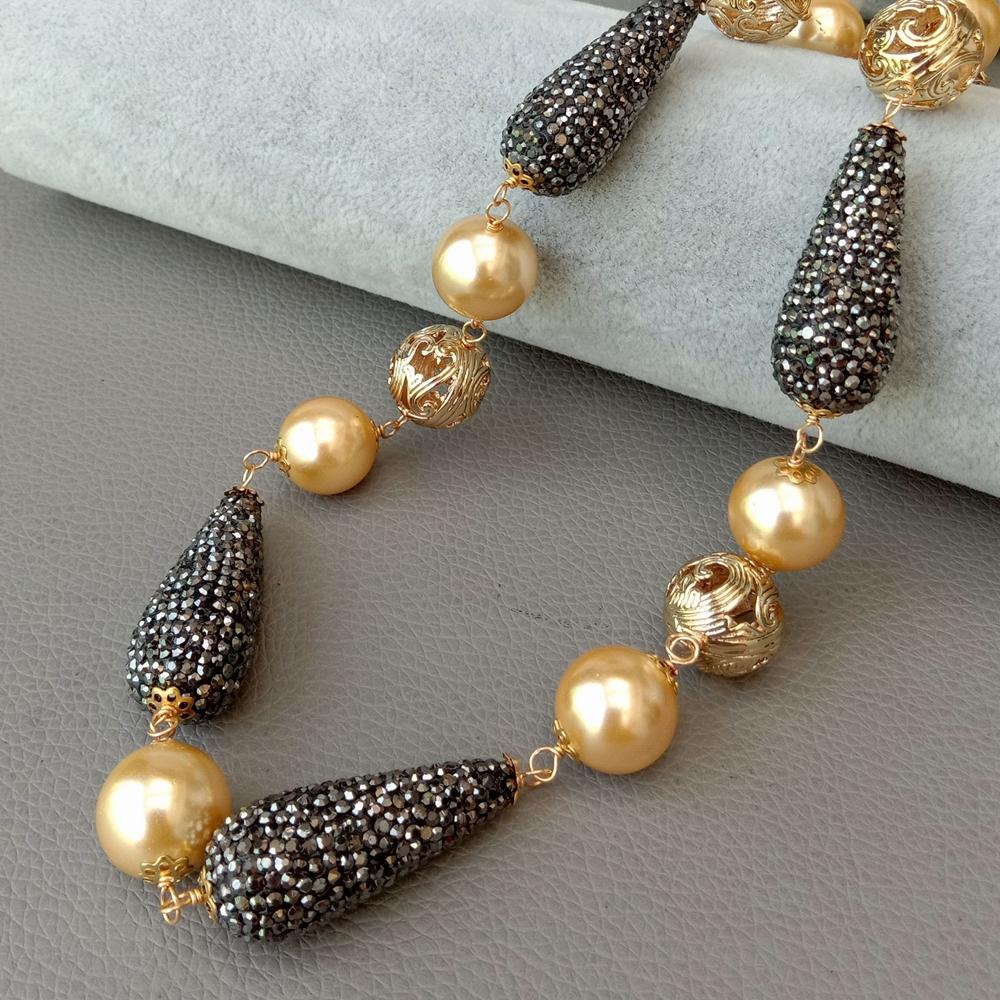 21" 16mm Yellow Sea Shell Pearl round Necklace black macarsite teardrop Pave Connector punk style for women