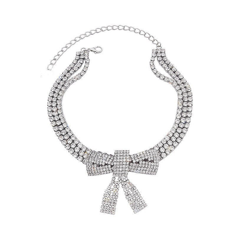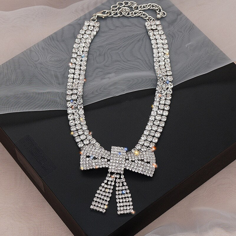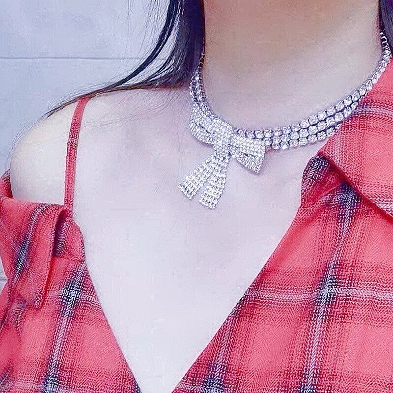 2pcs Sexy Full Rhinestone Bow-Knot Choker Necklace For Women Bling 3 Row Iced Out Chain Charm Party Jewelry