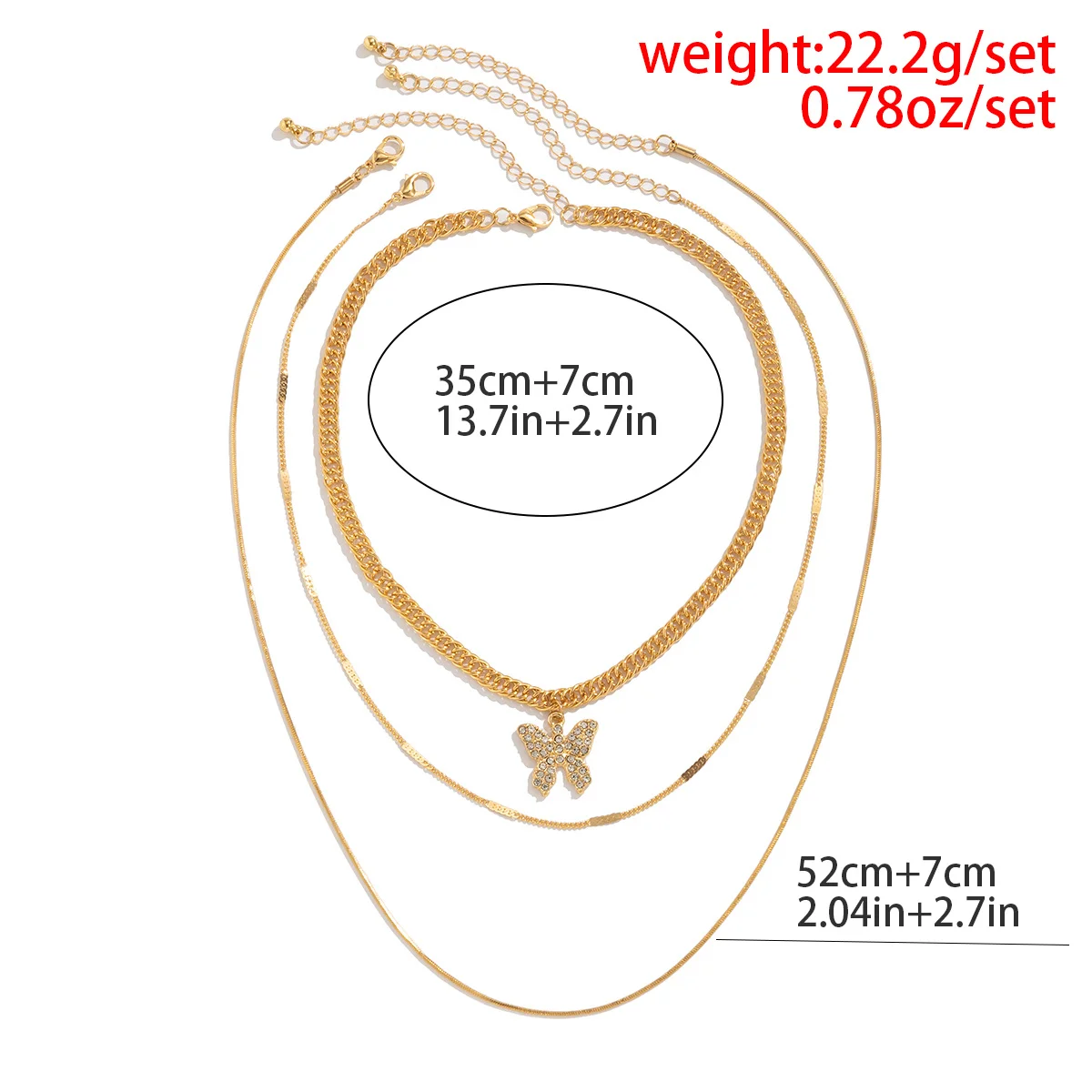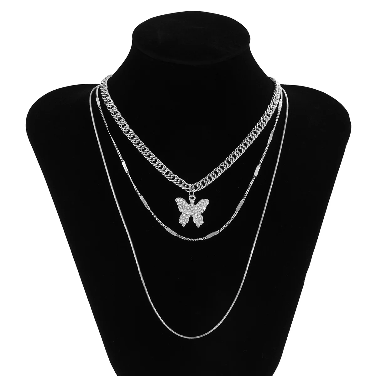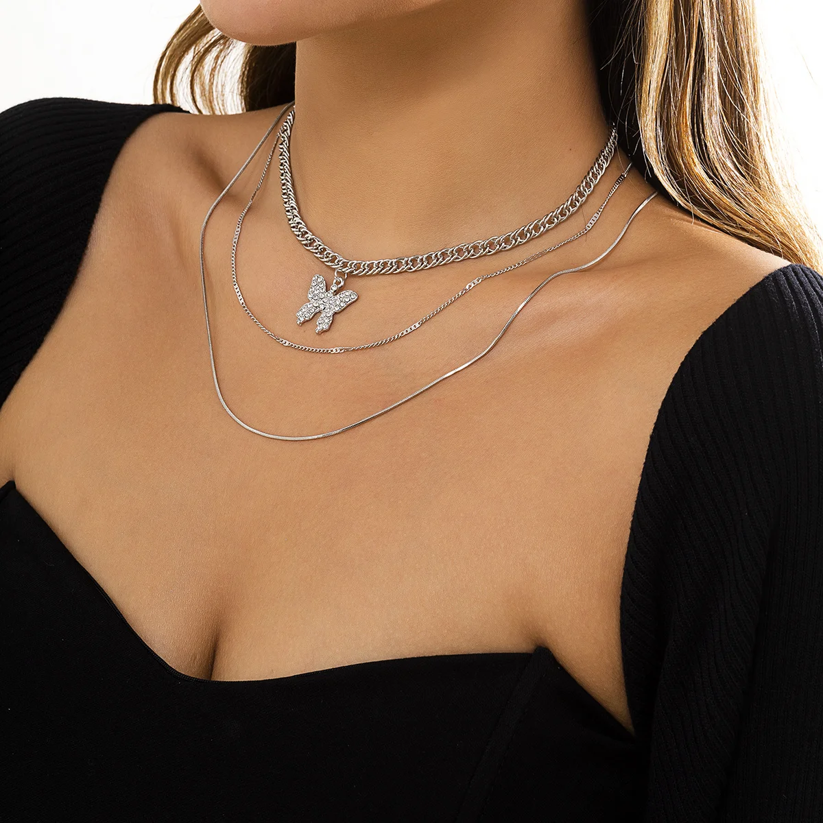 3pcs/Set Cute Full Rhinestone Butterfly Pendant Necklace For Women Punk Multi Layer Thin Snake Chain Choker Necklaces Jewelry