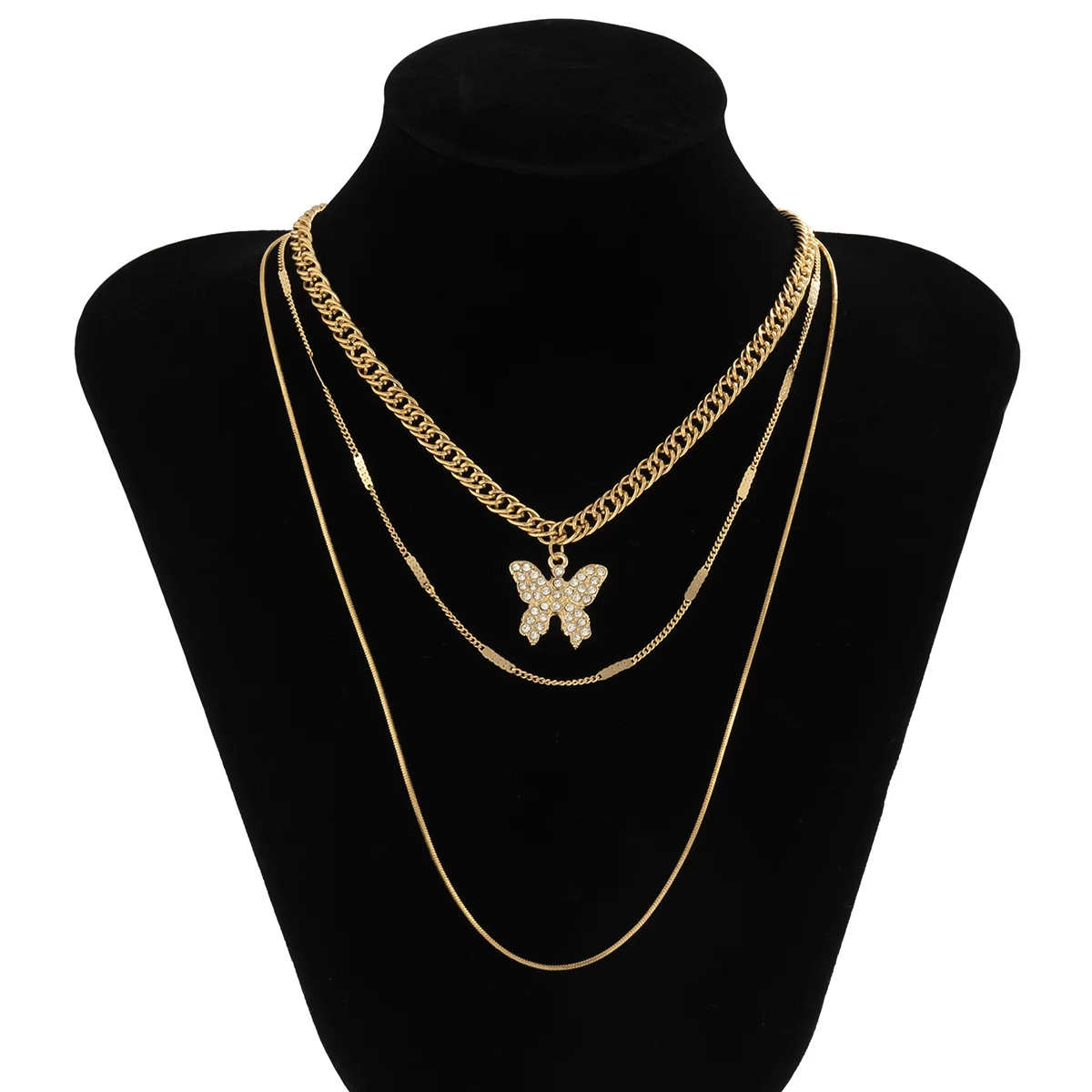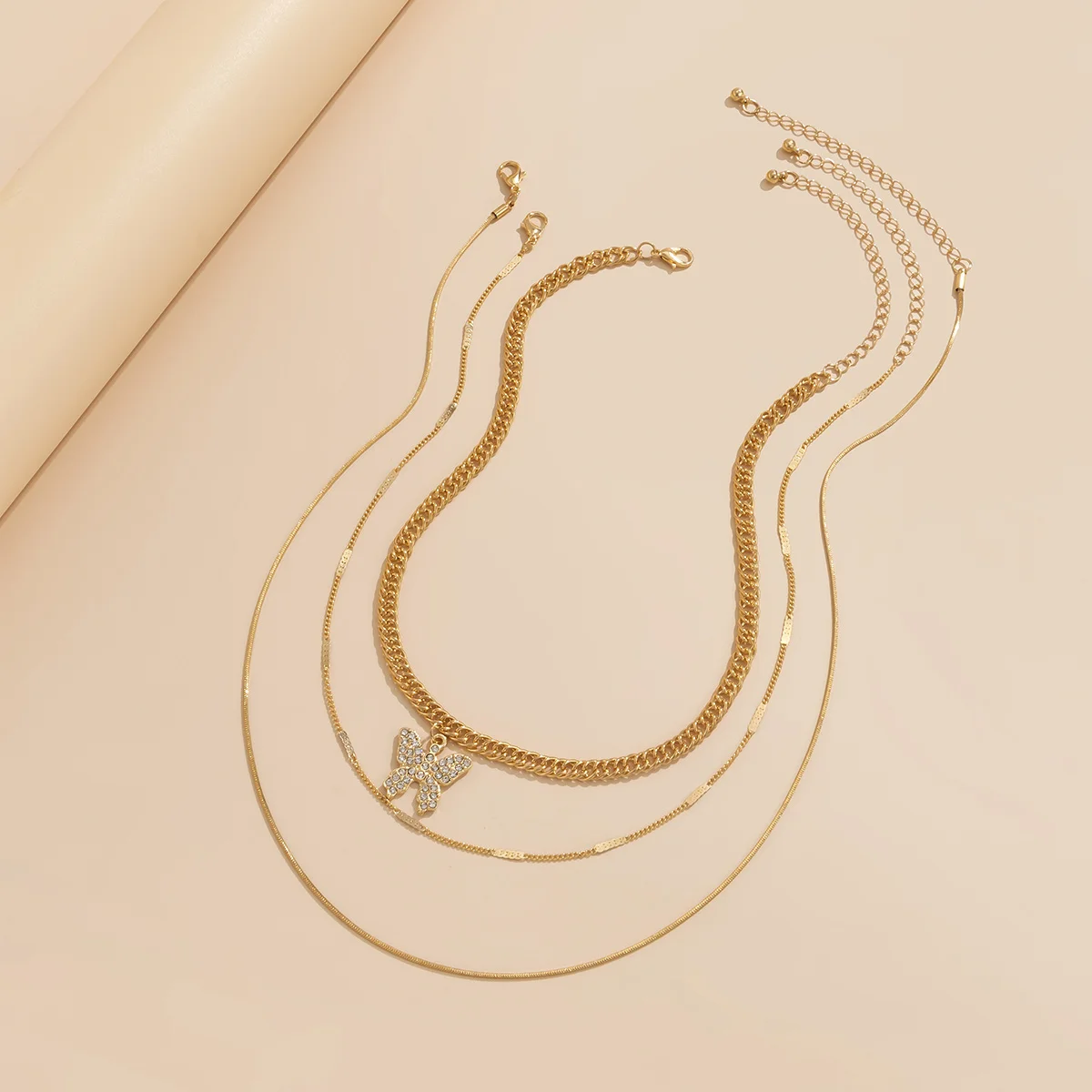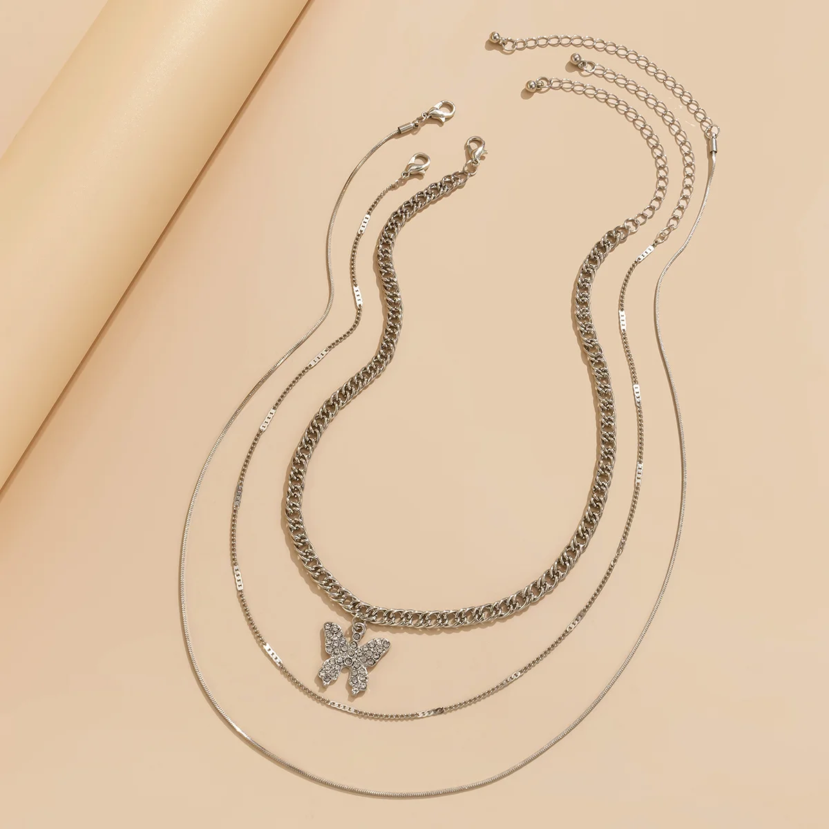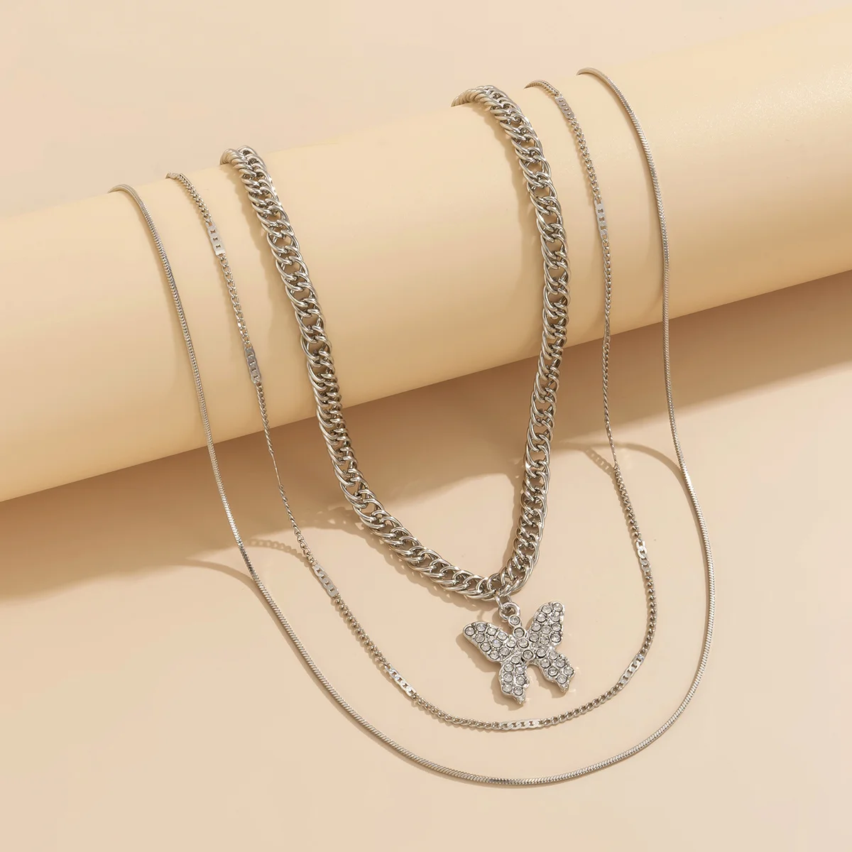 3pcs/Set Cute Full Rhinestone Butterfly Pendant Necklace For Women Punk Multi Layer Thin Snake Chain Choker Necklaces Jewelry