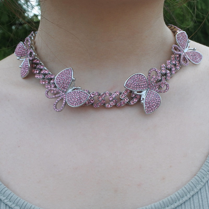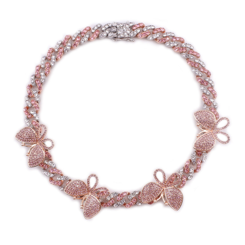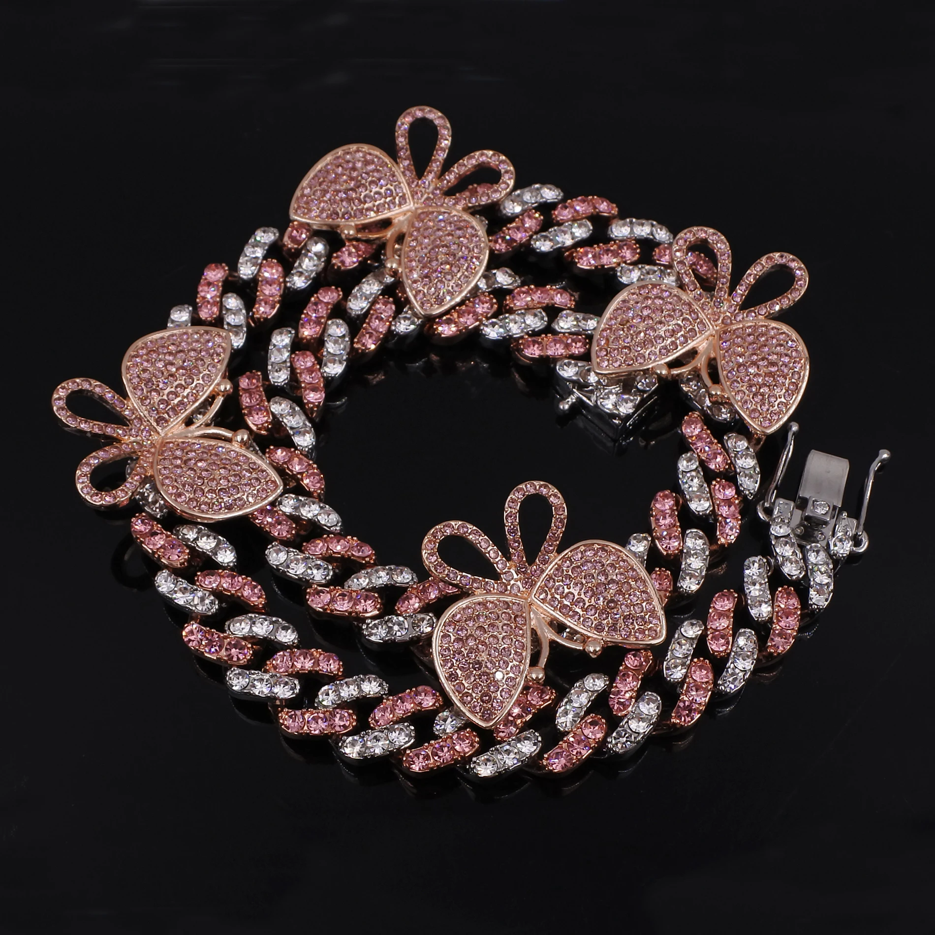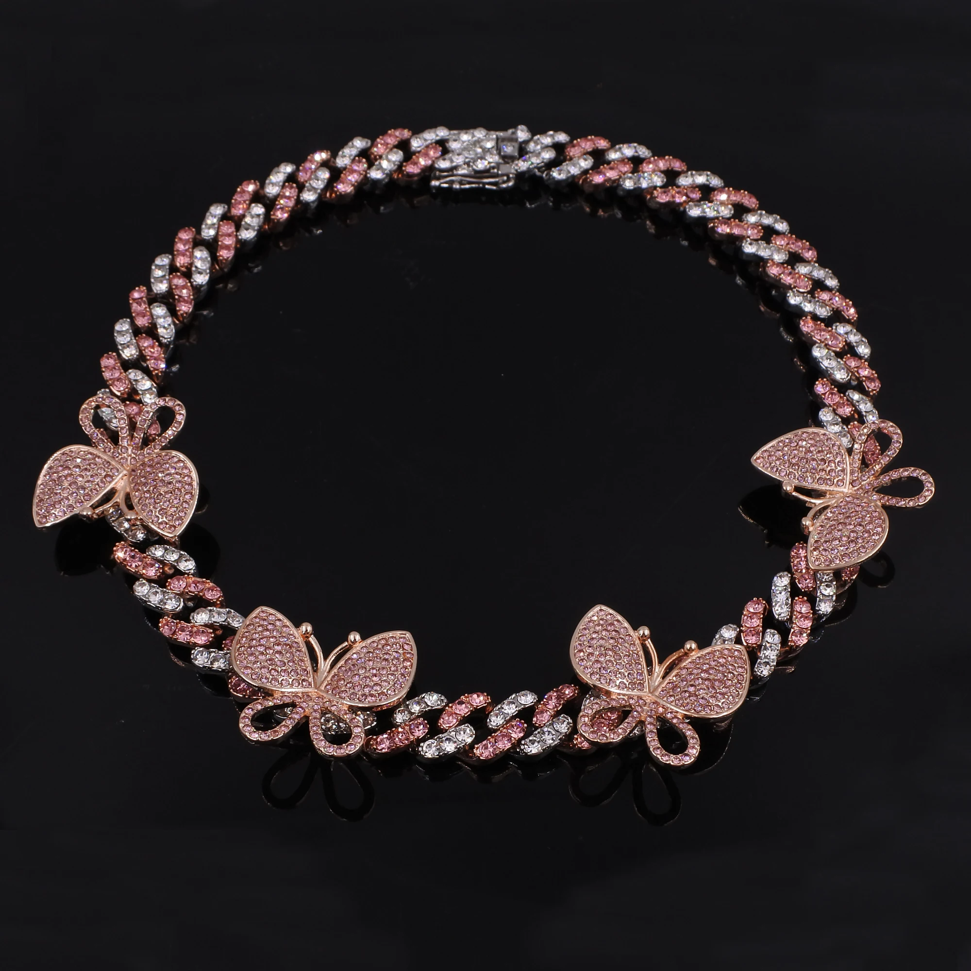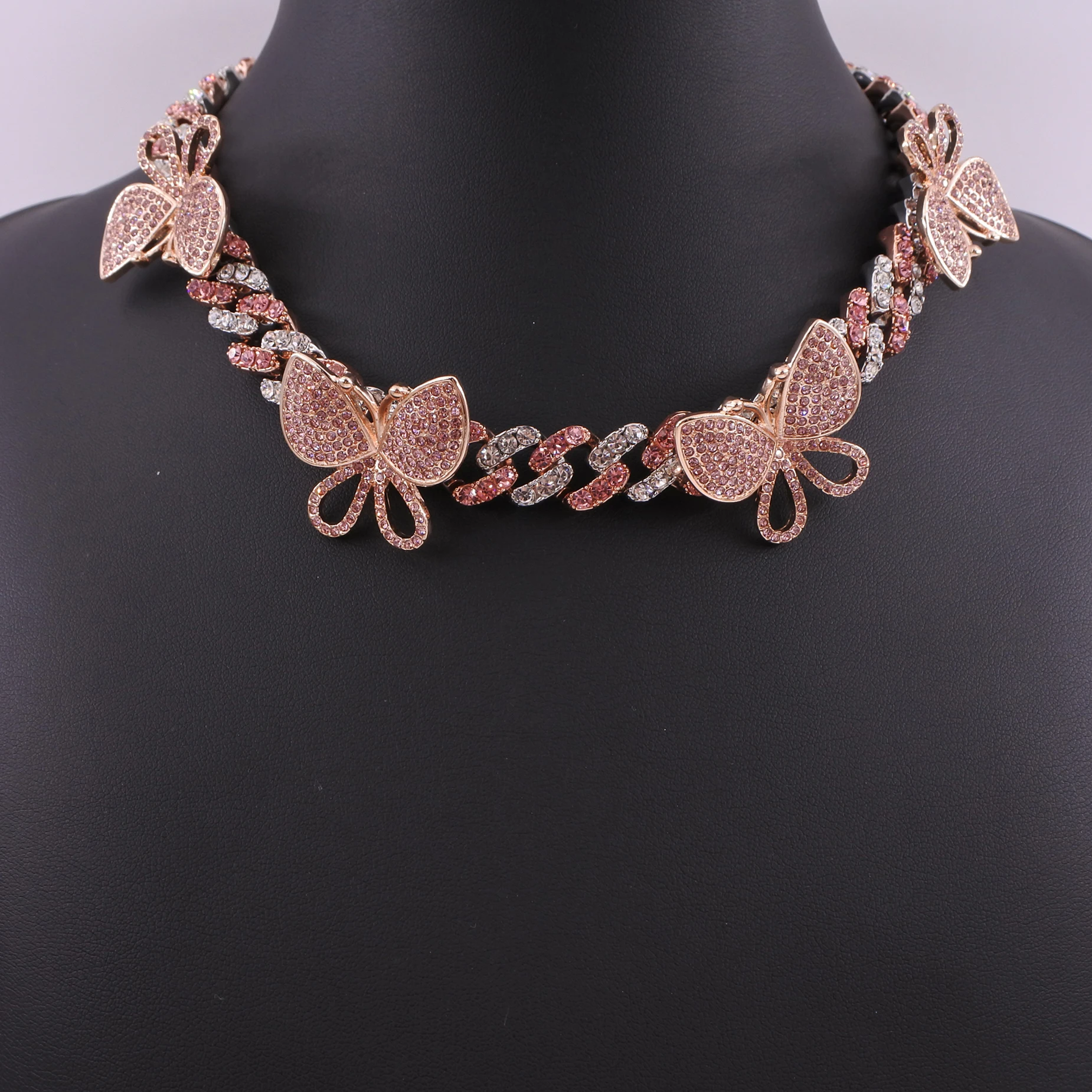 4pcs butterfly pendant charms necklace women hip hop miami cuban curb link chain iced out pink rose gold rapper punk jewelry cz