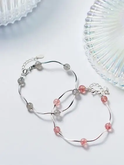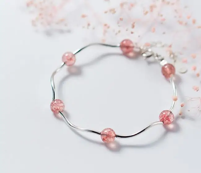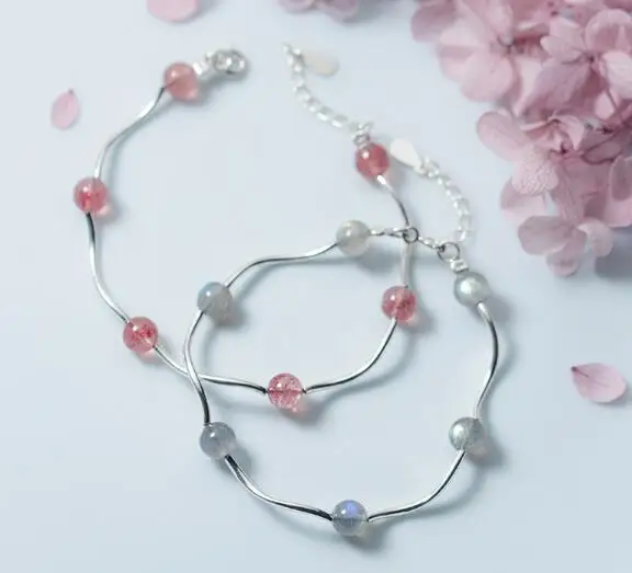6MM 100% Real. 925 Sterling Silver Fine Jewelry Rose Strawberry Quartz /Moonstone Stone & Twist Snakebone chain Bracelet LS761