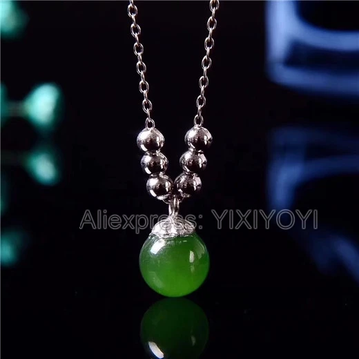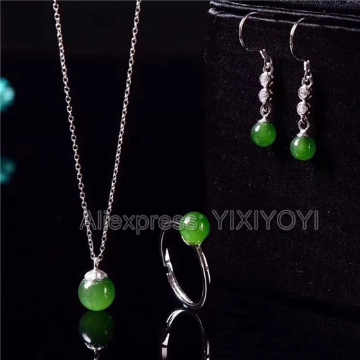 925 Silver Green HeTian Jade Jasper Beads Round Dangle Lucky Pendant + Chain Necklace Earring Ring Set Woman's Fine Jewelry