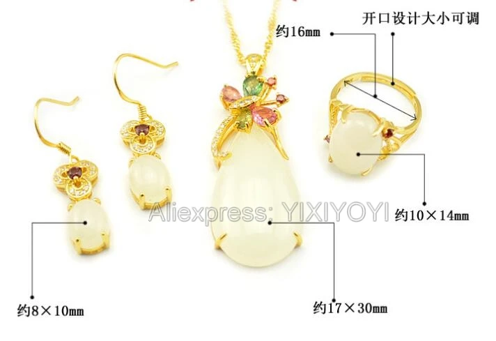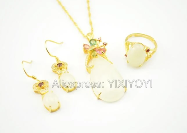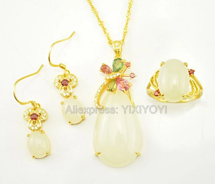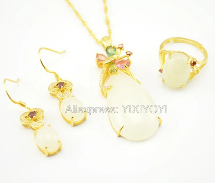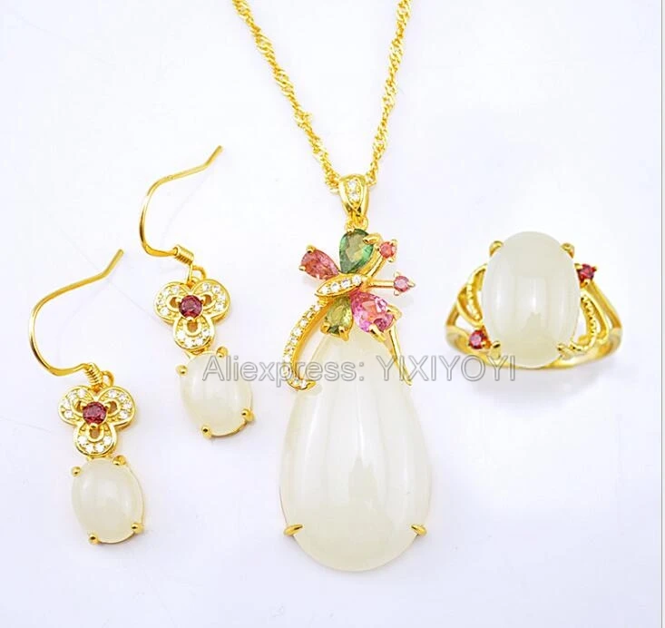 925 Silver Natural White White HeTian Jade Beads Inl Elegant Dangle Lucky Pendant Necklace Earring Ring Fine Jewelry Set