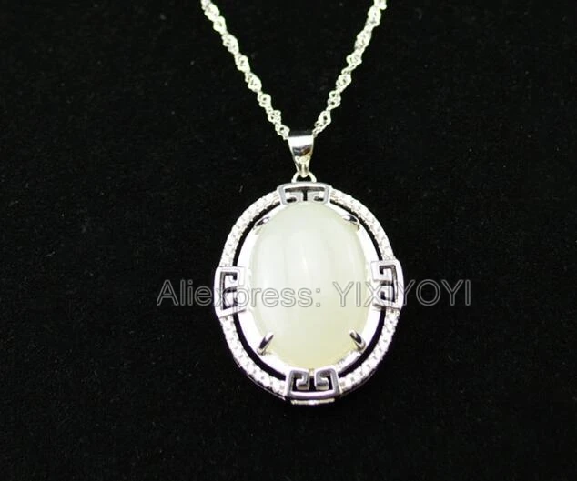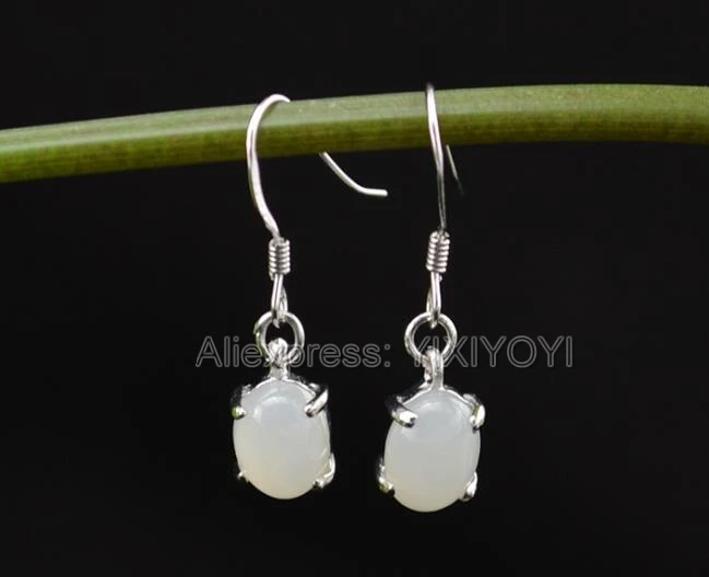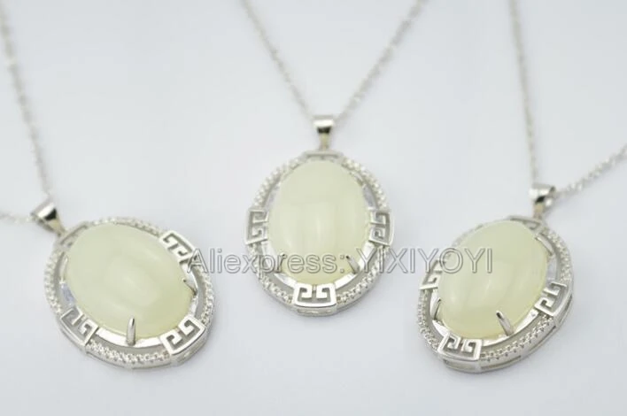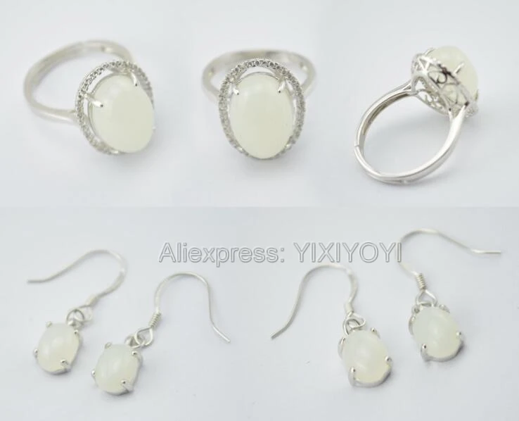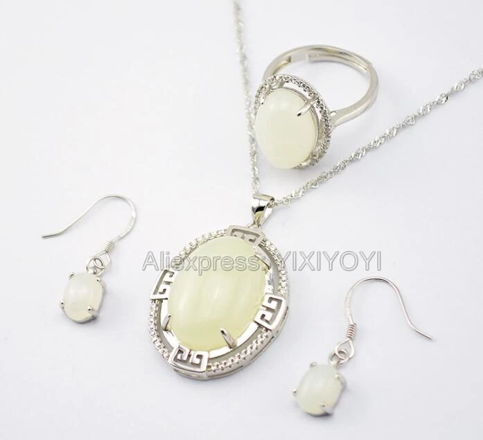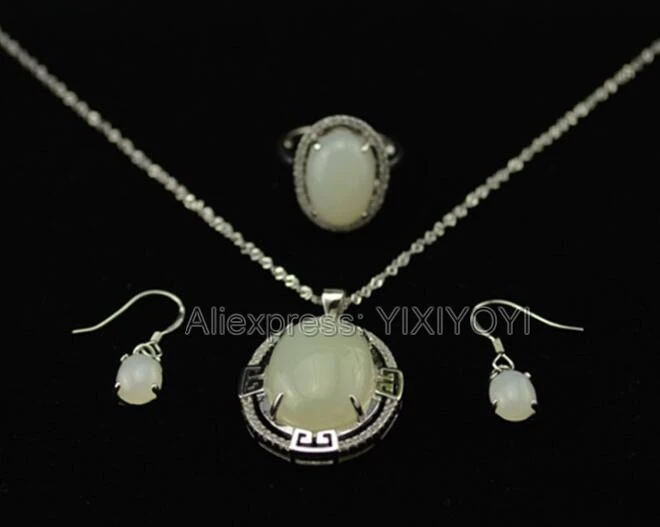 925 Silver Natural White White HeTian Jade Beads Inl Round Dangle Lucky Pendant Necklace Earring Ring Woman's Fine Jewelry Set