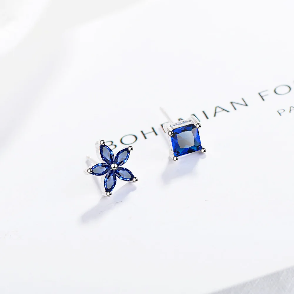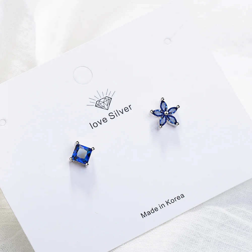 925 Stamp Silver Color Blue Zircon Earring Asymmetry Round Korea Retro Geometry Children's Stud Earings Jewelry 2022
