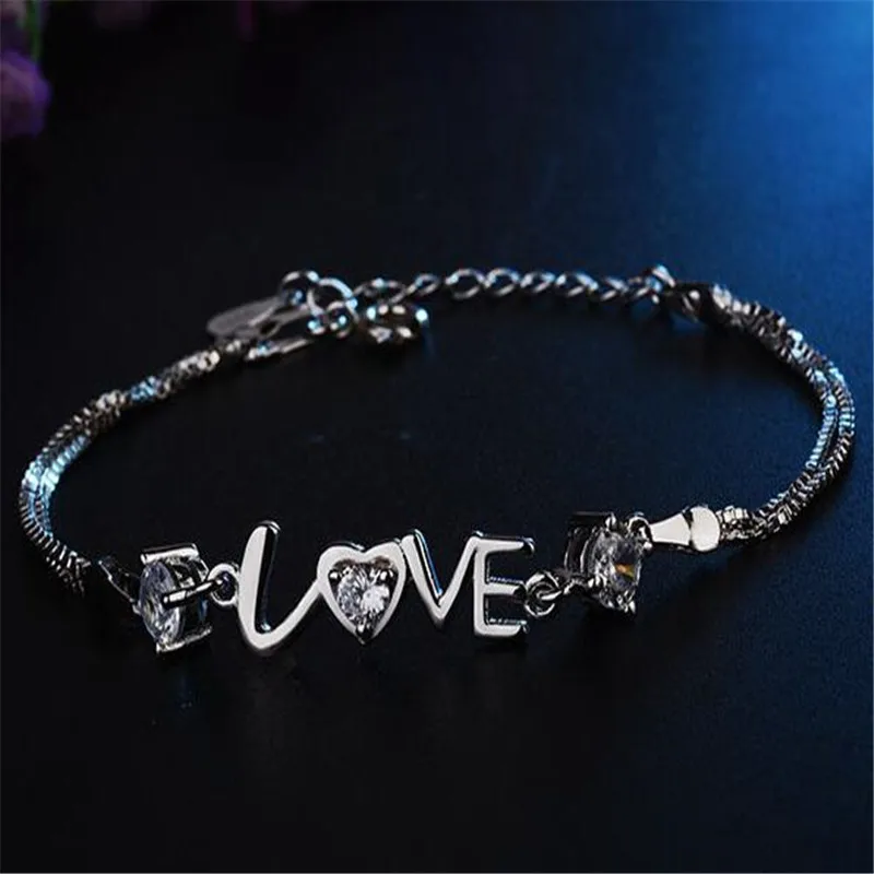 925 Stamp Silver Color Bracelet Heart Love Round Cubic Zirconia Double Chain Linked For Women Charm Bangle Jewelry Christmas