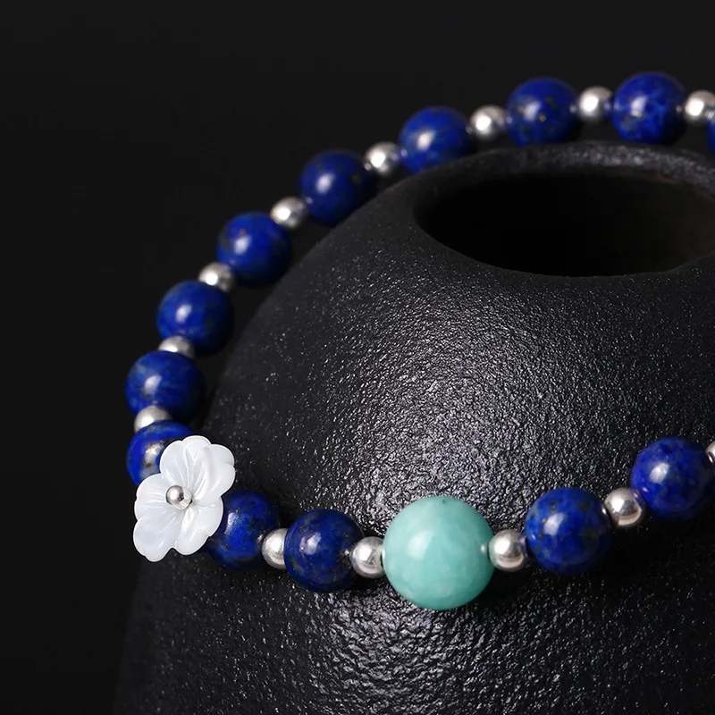925 Sterling Silver Bracelet Handmade Vintage Hand String Shell Flower With Natural Lapis Amazon Stone High Quality