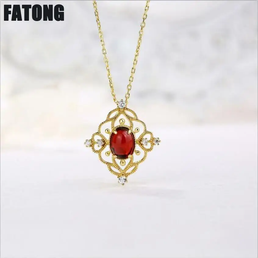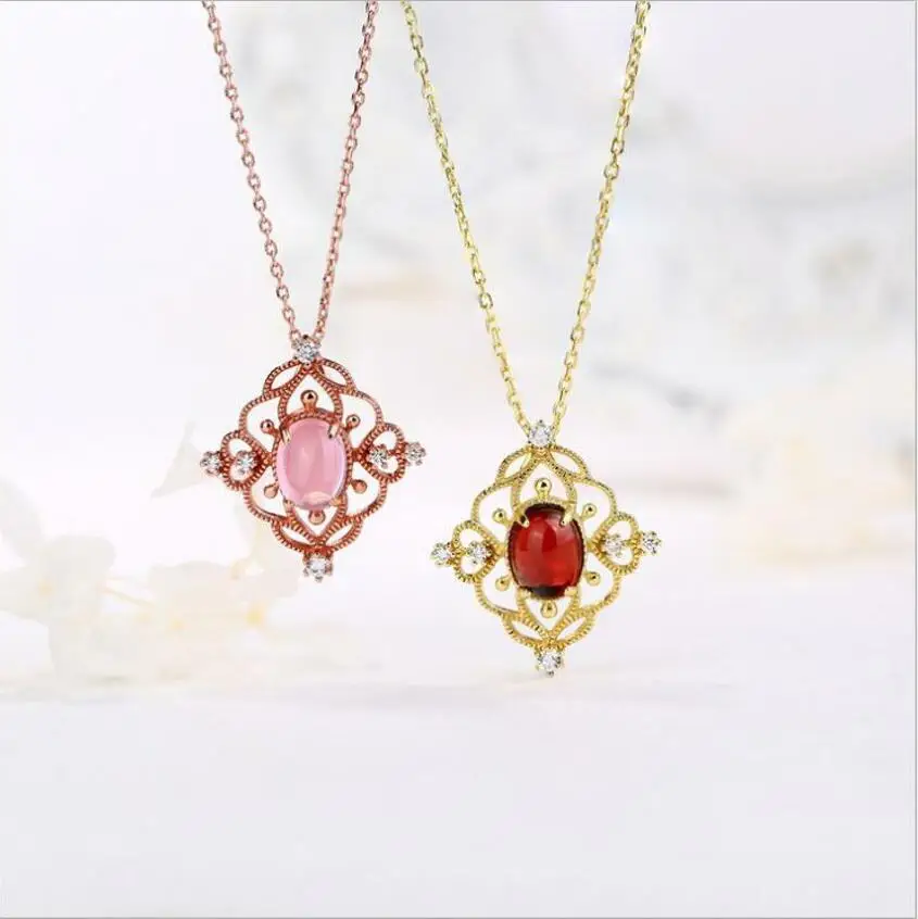 925 sterling silver classical style garnet rose quartz necklace female retro beautiful wild J0241