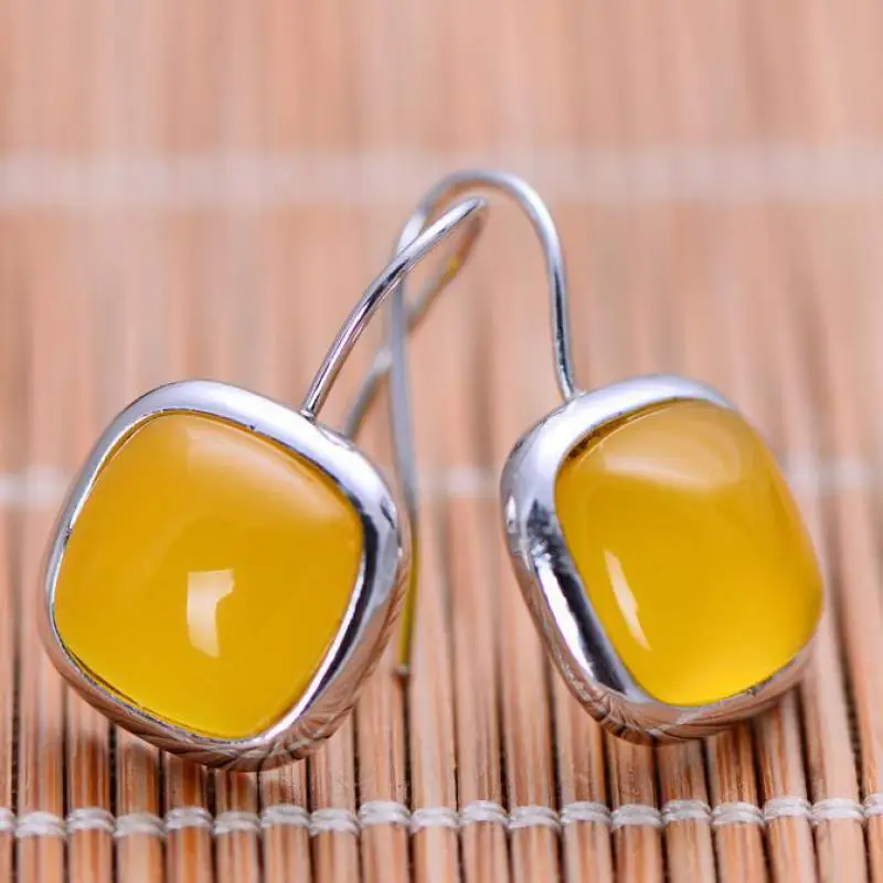 925 Sterling Silver Jewelry Yellow Chalcedony Earrings Natural Stone Square Shaped Simple Earrings For Women Fine Jewelry