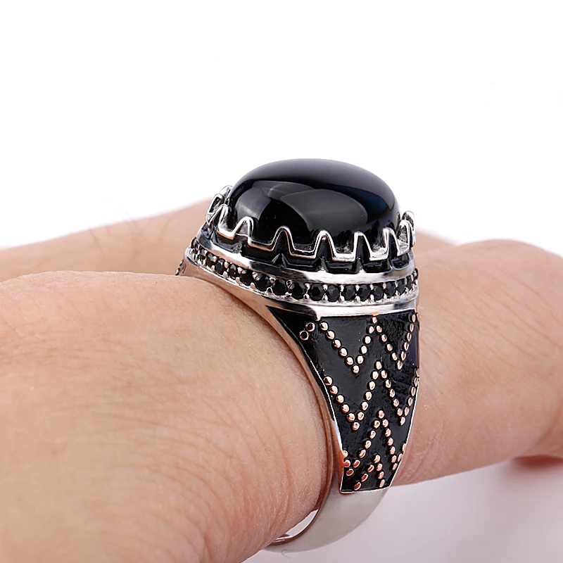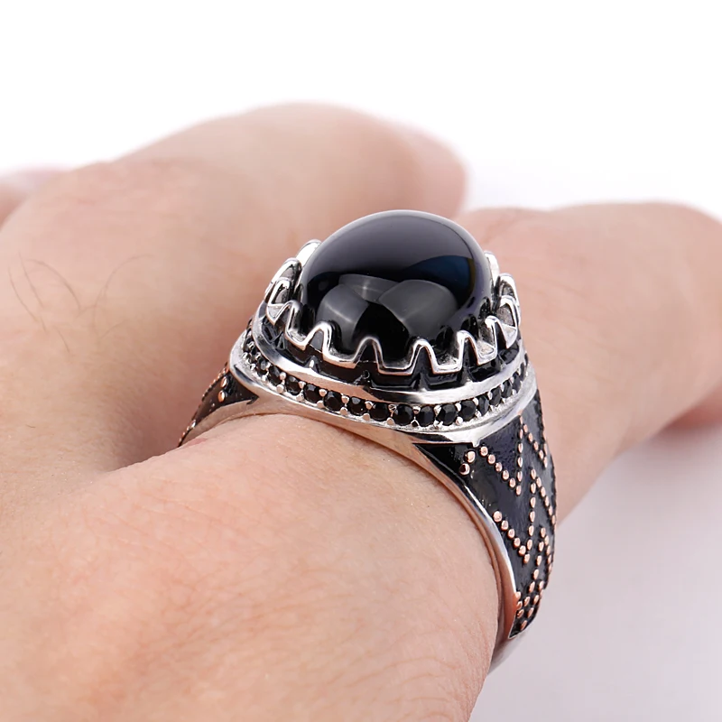 925 Sterling Silver Men Ring Black Agate Stone with Black Zircon Stone Punk Style for Male Ring Fine Jewelry