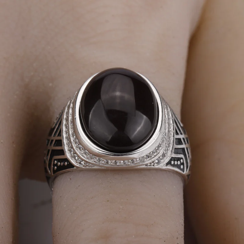 925 Sterling Silver Men Ring Dark Brown Agate Stone with Clear CZ Men Punk Finger Ring Fine Jewelry