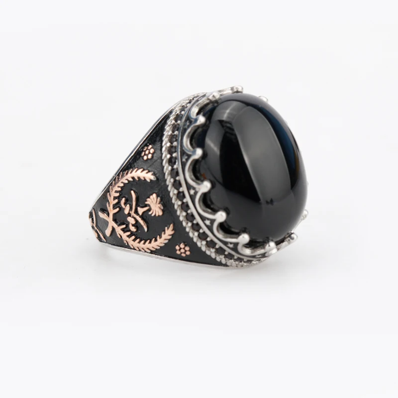 925 Sterling Silver Ring Crown Bezel Setting Oval Black Agate Stone with Rose Gold Grass for Men Party Fine Jewelry