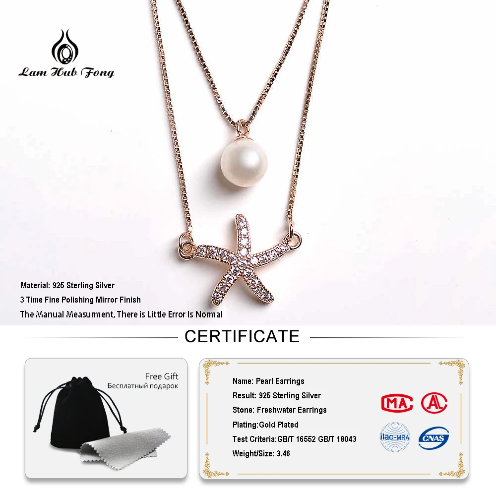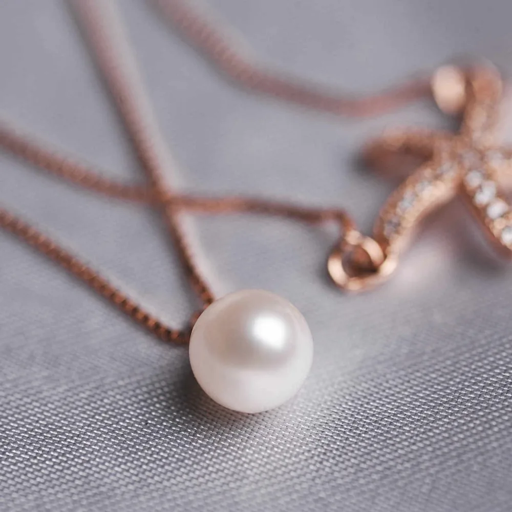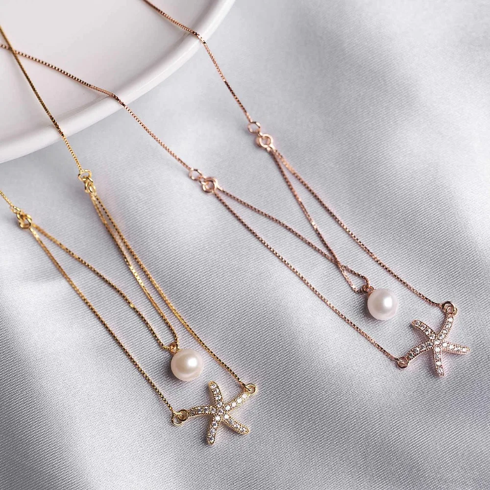 925 Sterling Silver Starfish Pendant Necklace Pearl Sea Star Gold Color Cubic Zirconia Simple For Women Bijoux Femme