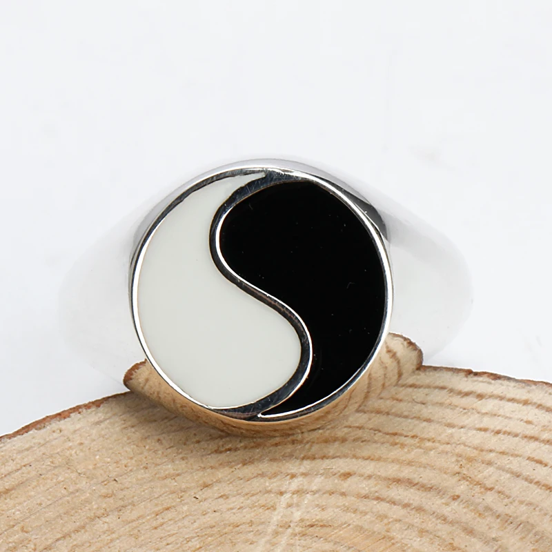 925 Sterling Silver Tai Chi Yin Yang Ring White & Black Enamel Personality Balance Asian Vintage Ring on a Finger For Men Women