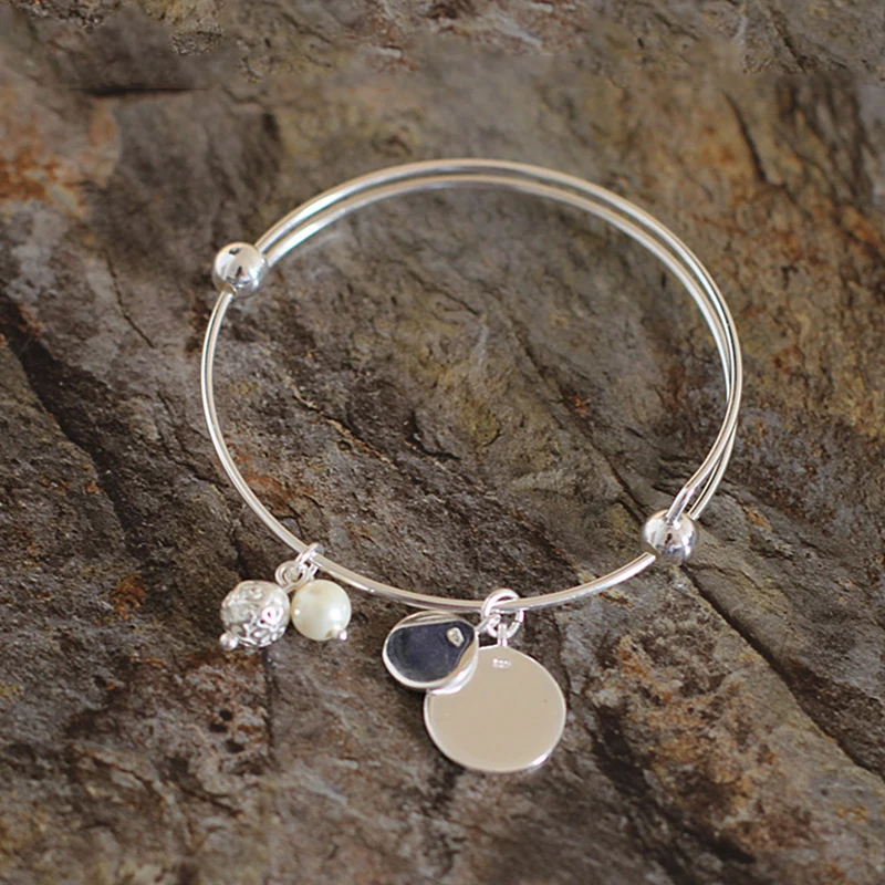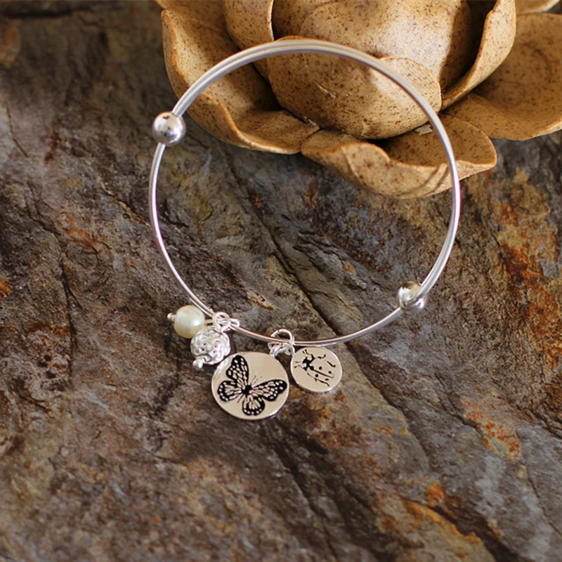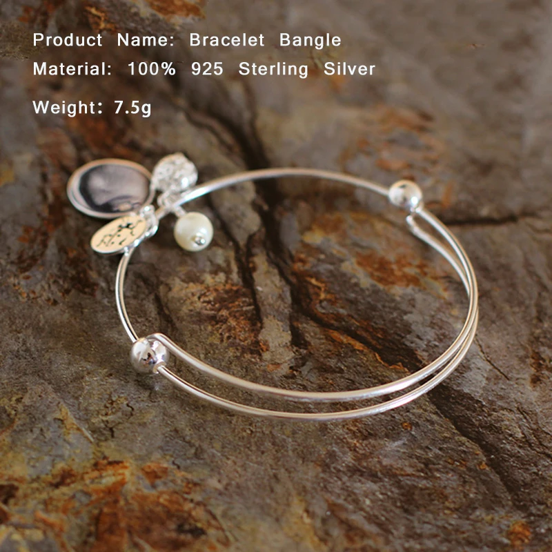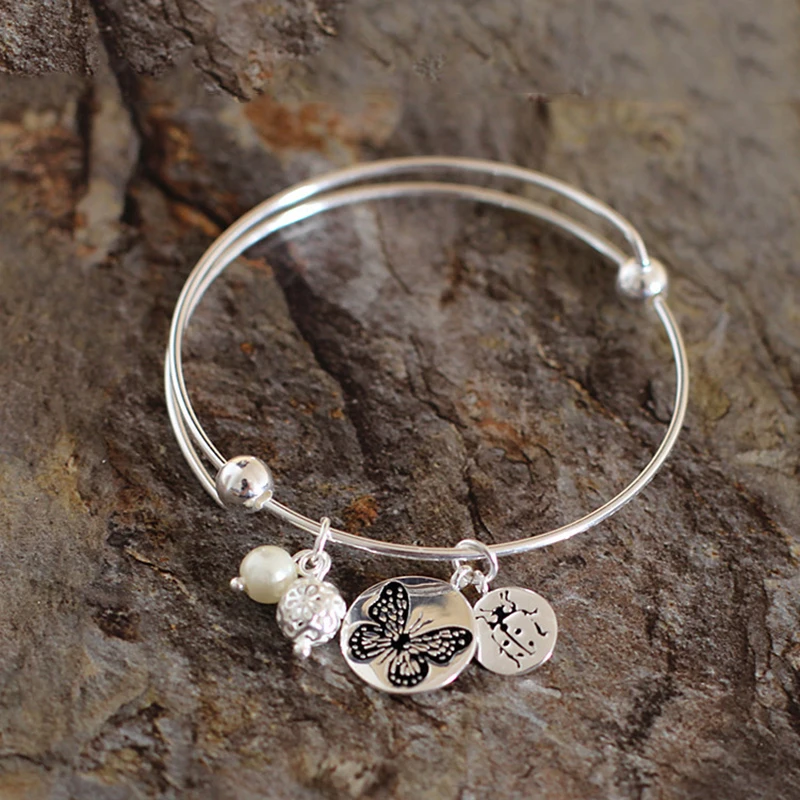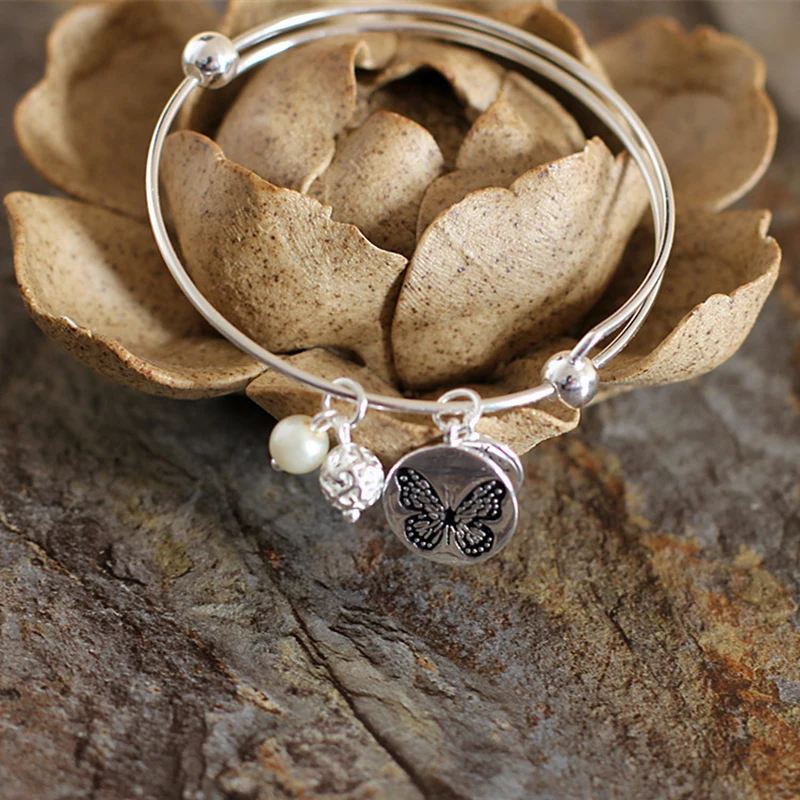 Adjustable Pearl Bangle Carving Insect Butterfly 100% Real Silver 925 Sterling Bracelet For Women Fine Jewelry SB28