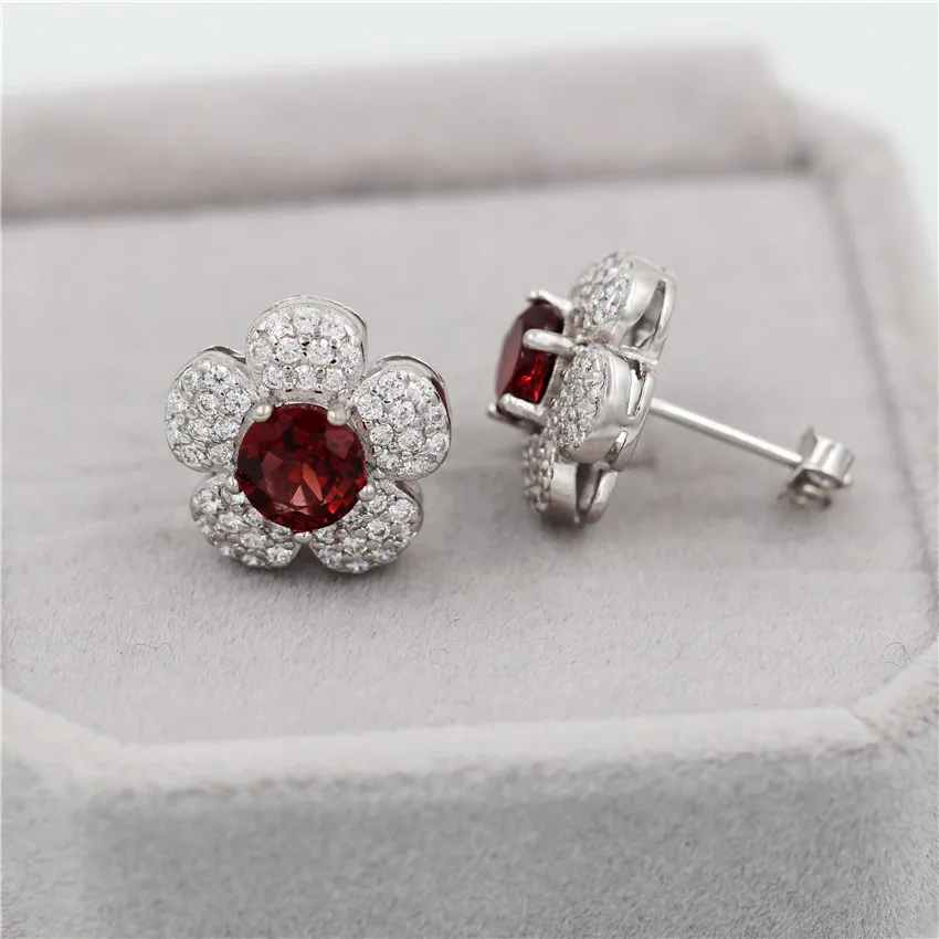 925 Sterling Silver Jewelry Sparkling Flower 0.5ct Red Fire Garnet Health Stud Earrings for Women Free Box 40% FR013