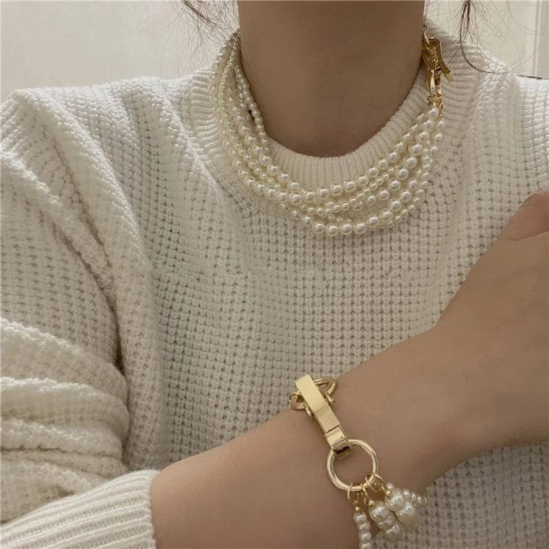 AOMU 2021 Design Vintage Geometric Multilayer Imitation Pearl Necklace For Women Girls Party Jewelry Accessories
