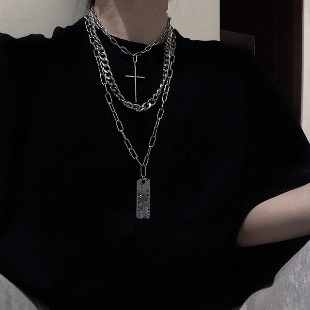AOMU 2021 Multilayer Hip Hop Long Chain Necklace For Women Men Jewelry Gifts Key Cross Pendant Necklace Accessories