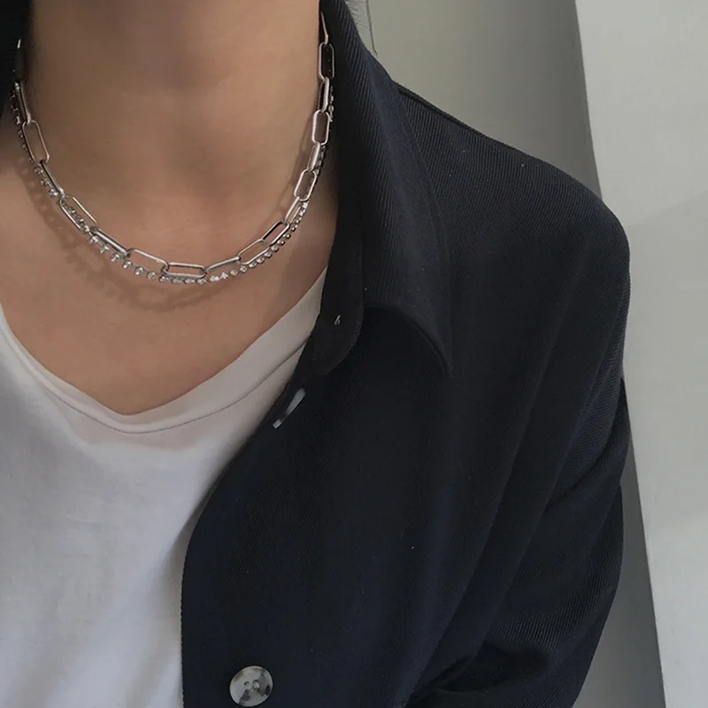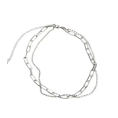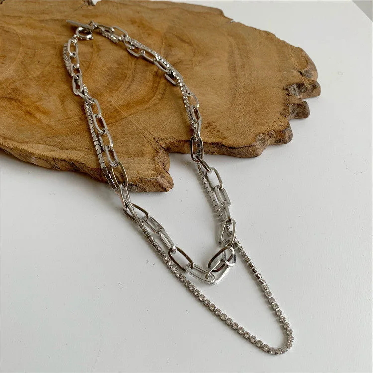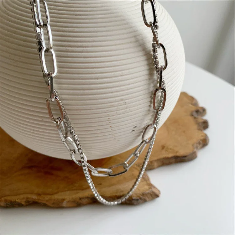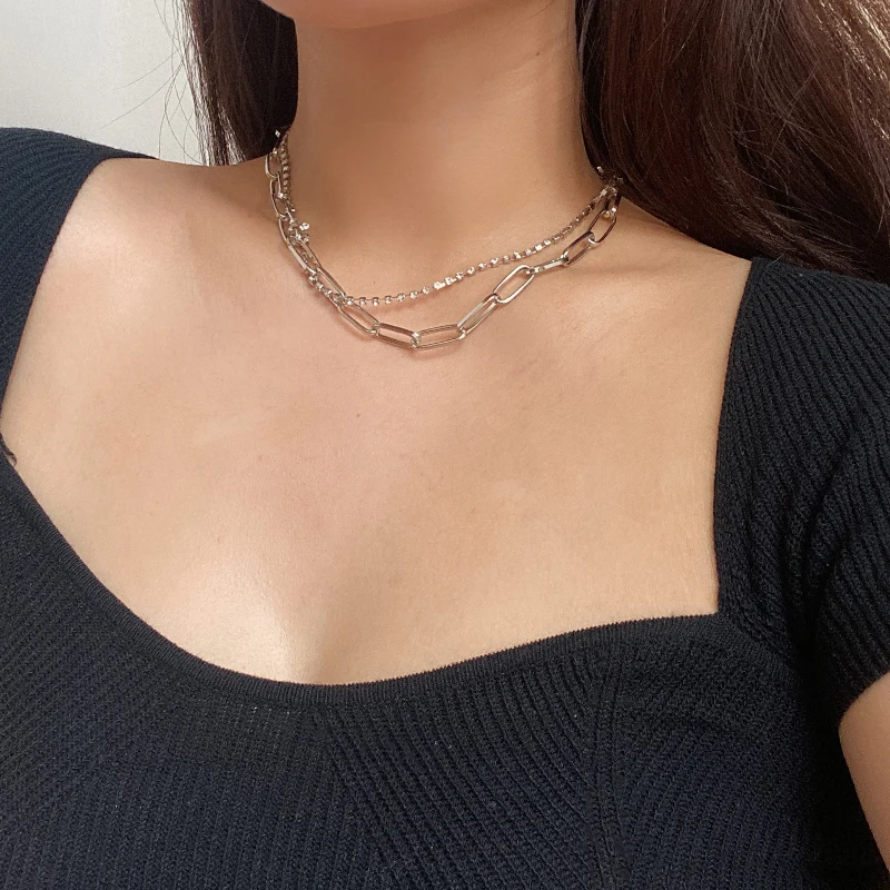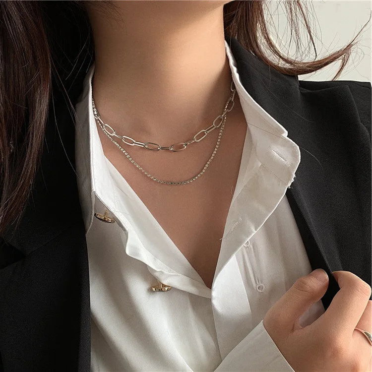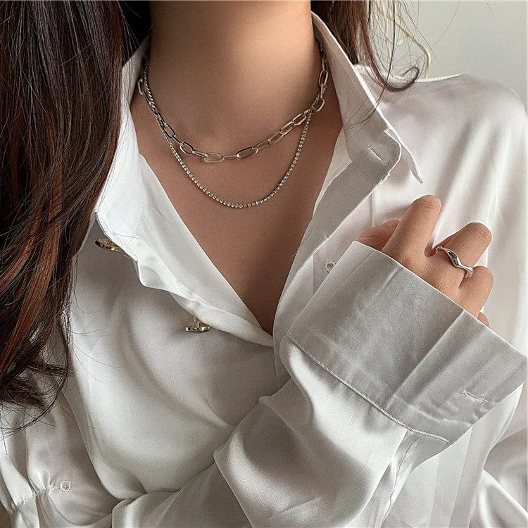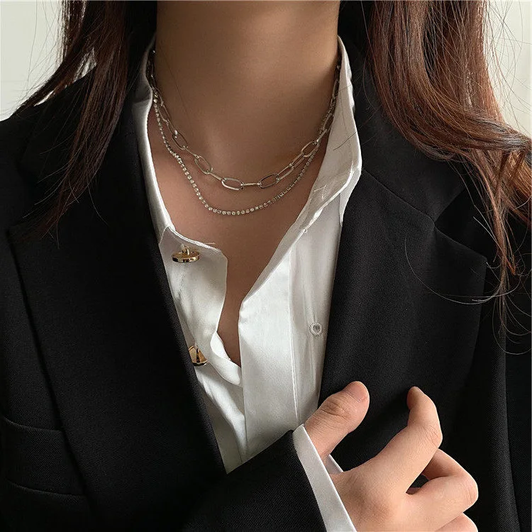 AOMU French Retro Silver Color Double Layer Metal Chain Clavicle Chain Zircon Necklace for Female Sweater Chain Jewelry