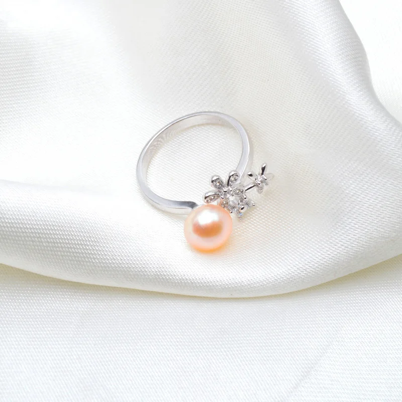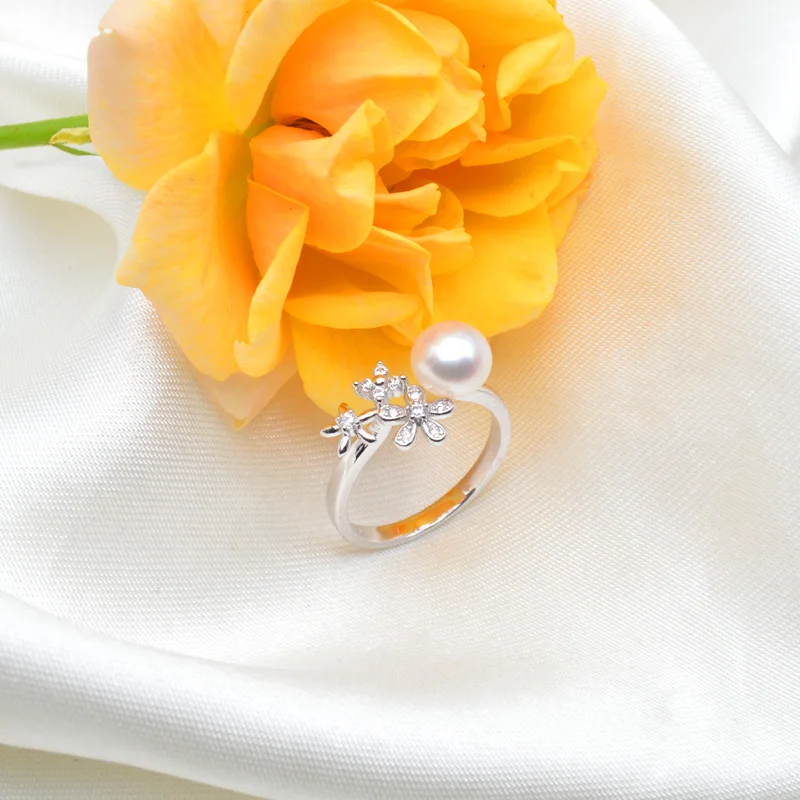 Genuine 925 Sterling Silver Ring Natural pearl jewelry Flower Open Finger clear CZ for women