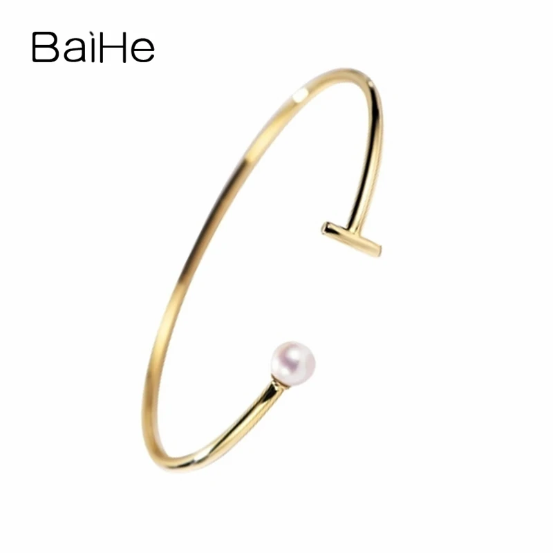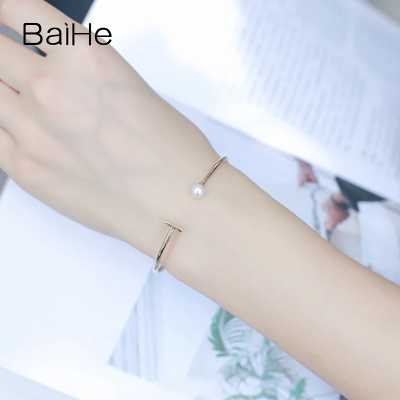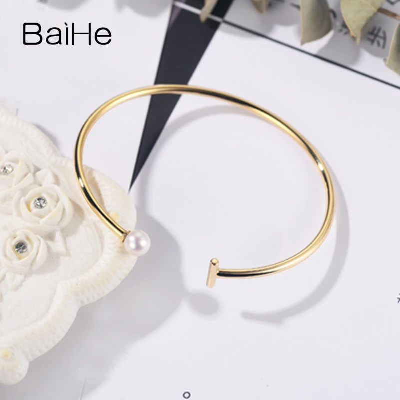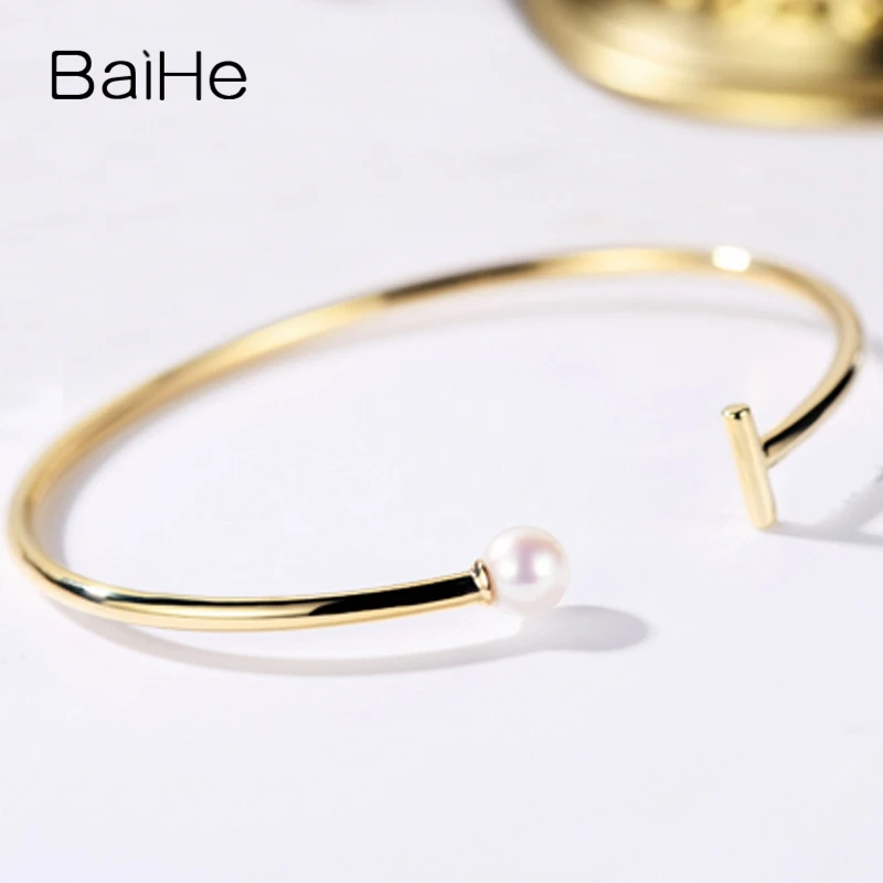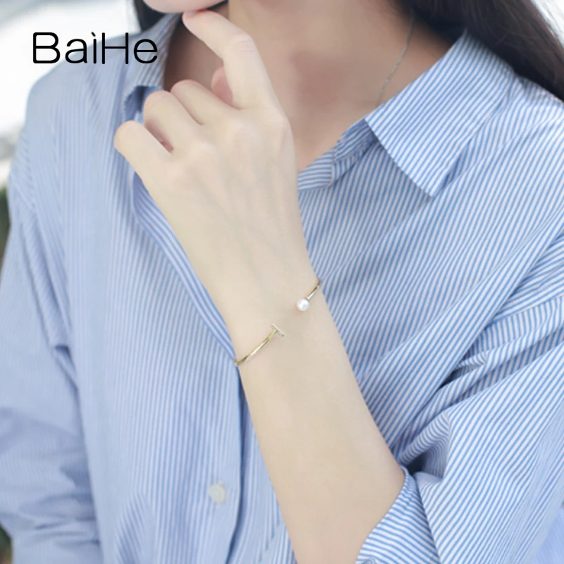 BAIHE Solid 14K Yellow Gold 5-5.5mm Certified Round Flawless 100% Genuine Natural Pearl Wedding Women Trendy Bracelet