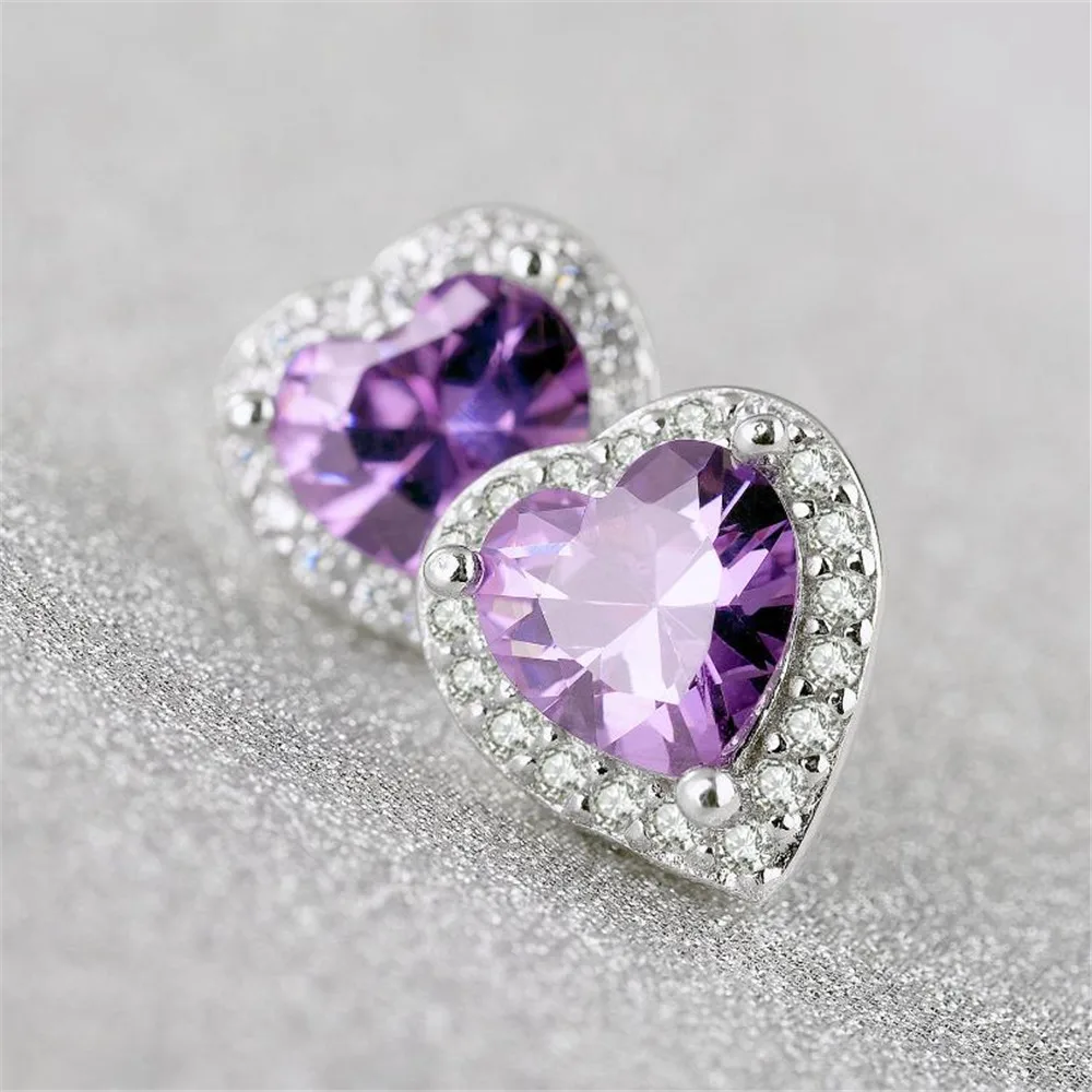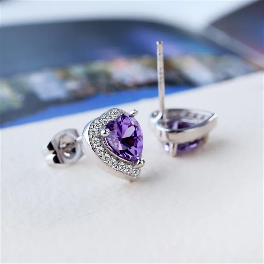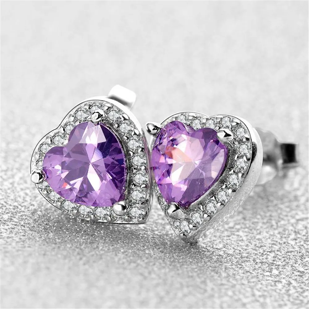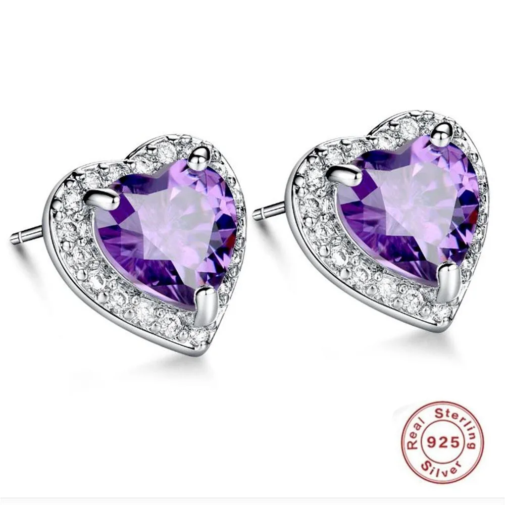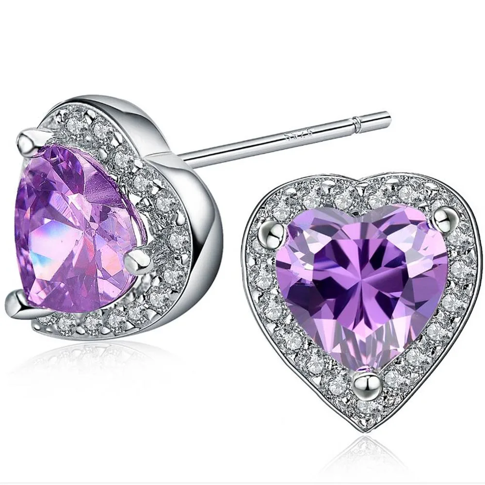 Women's S925 Strling Silver Earring Studs Exquisite Purple Heart Shaped Inlaid Zircon Studs Party Jewelry