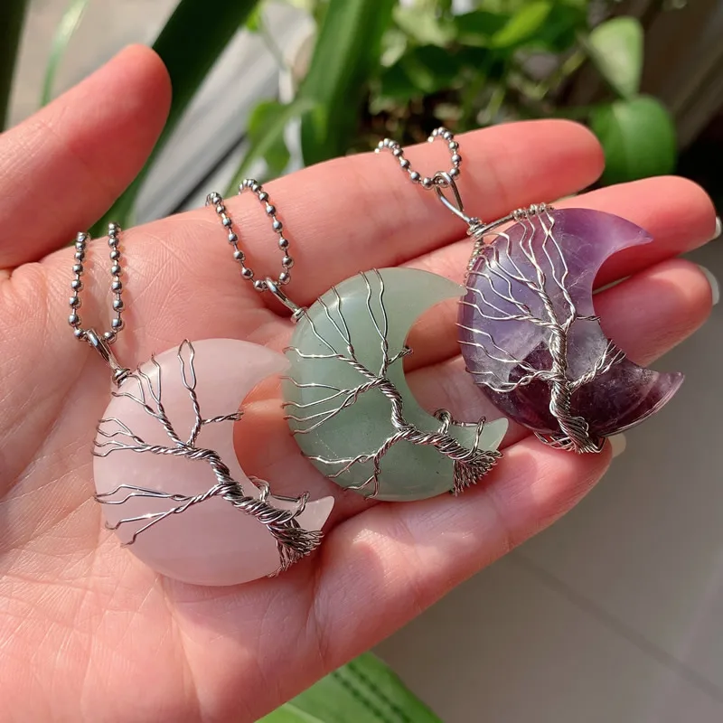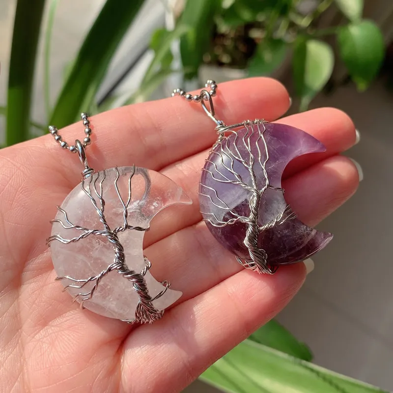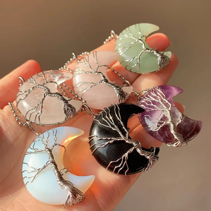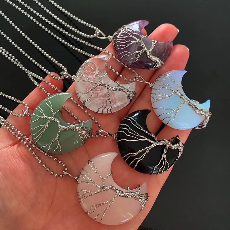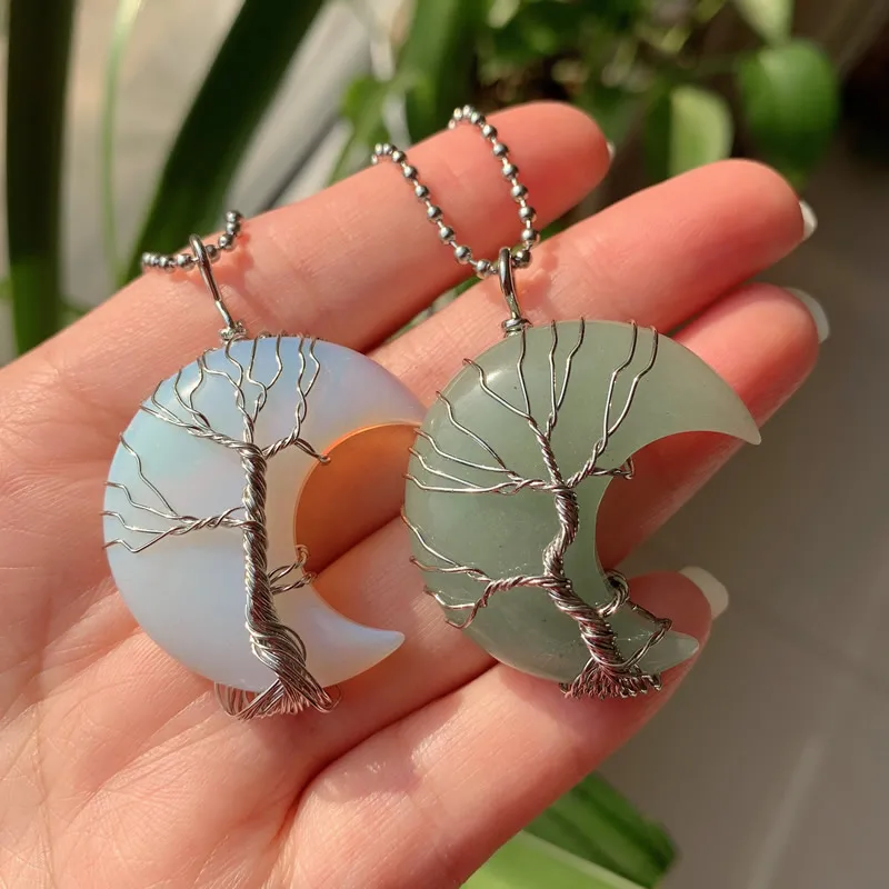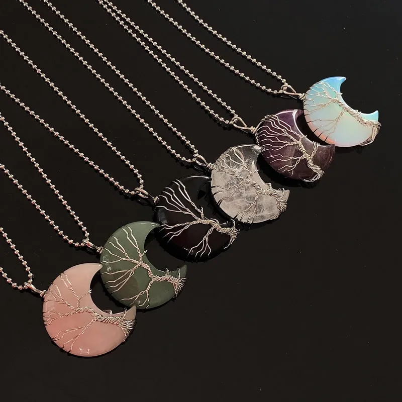 Big Moon Crescent Wire Wrap Tree Natural Crystal Pendant Quartz Pendulum Opal Amethysts Pink Crystal Necklace Healing Stone