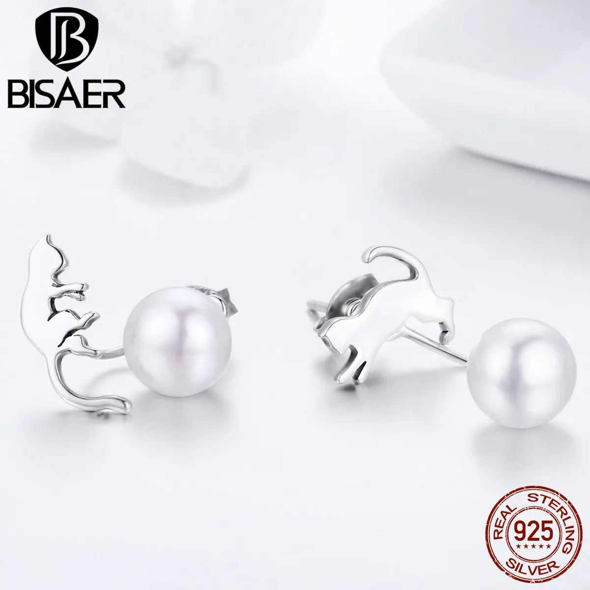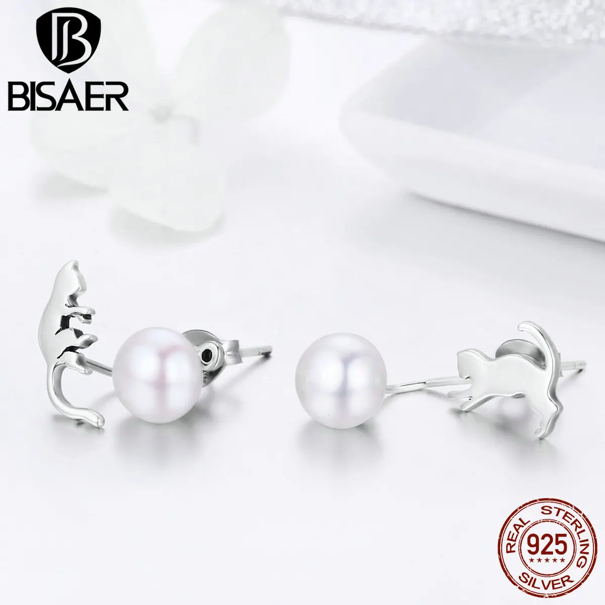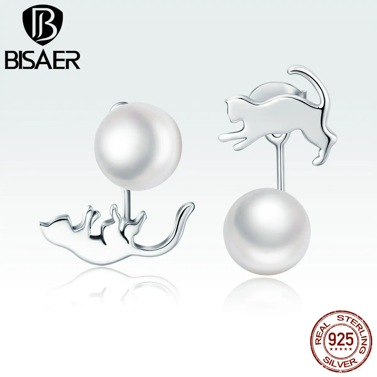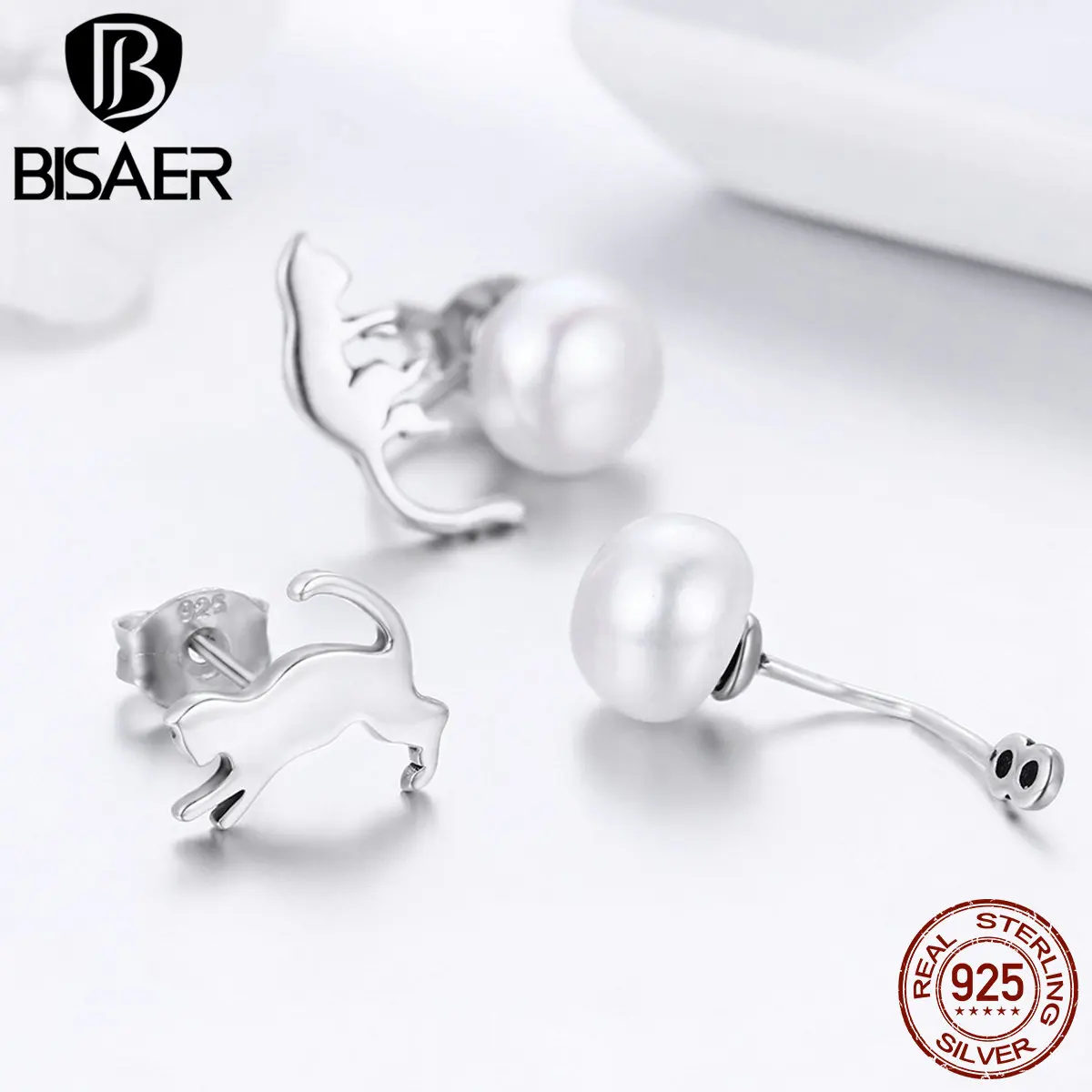 BISAER 925 Sterling Silver Natural White Pearls Naughty Cat Earring Jackets Asymmetry Earrings for Women Fine Jewelry GXE364