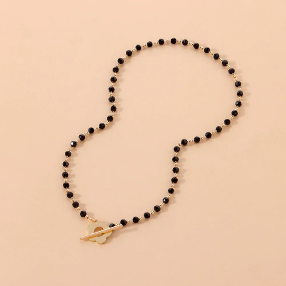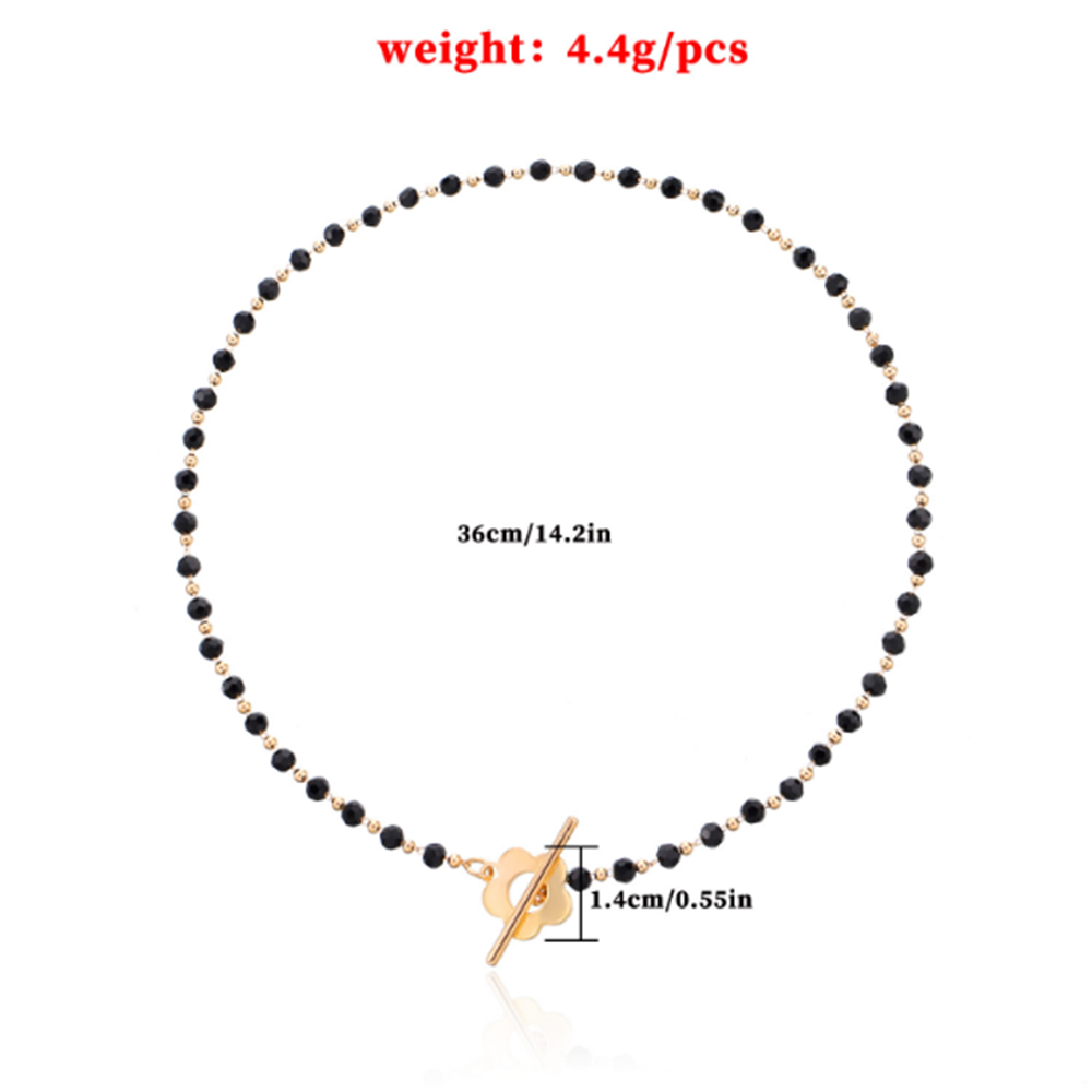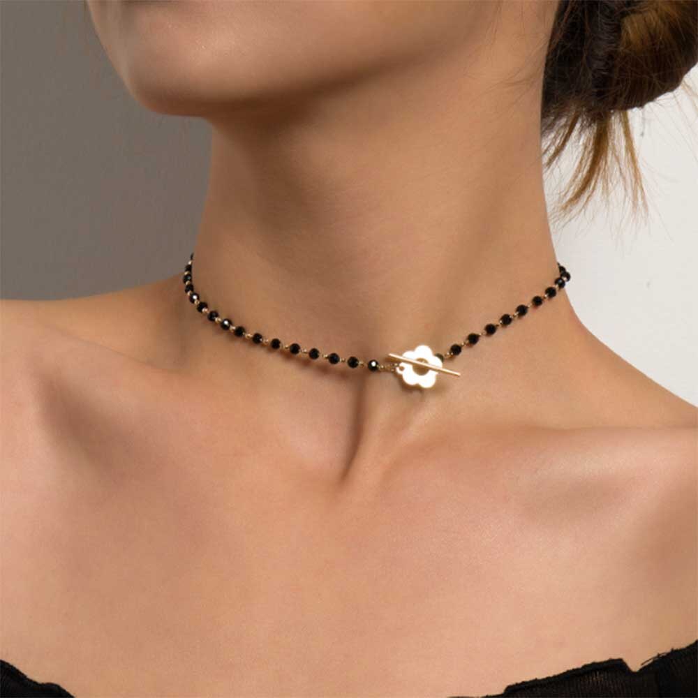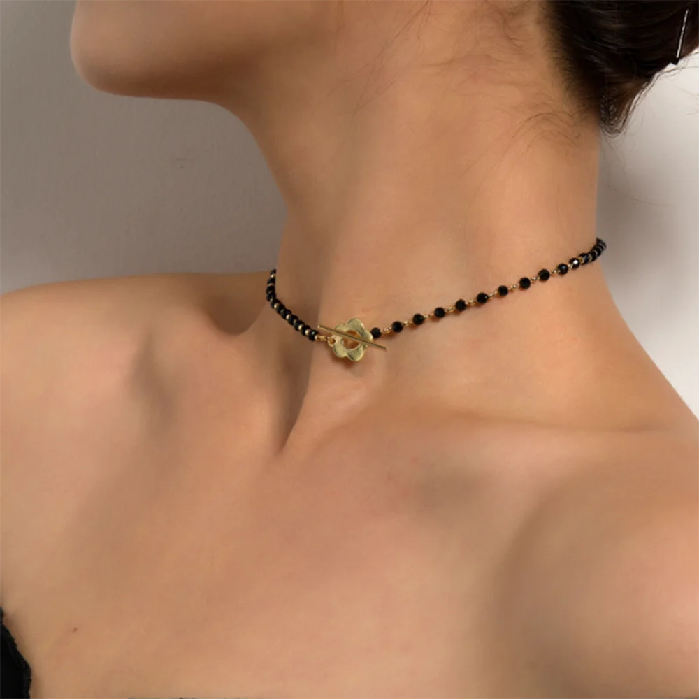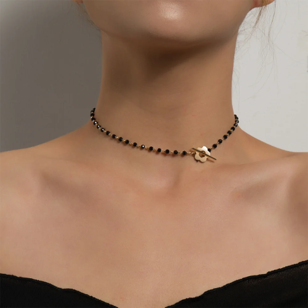 Black Crystal Glass Bead Choker Necklace Flower Lariat Lock Collar Necklace Elegant Temperament Clavicle Chain