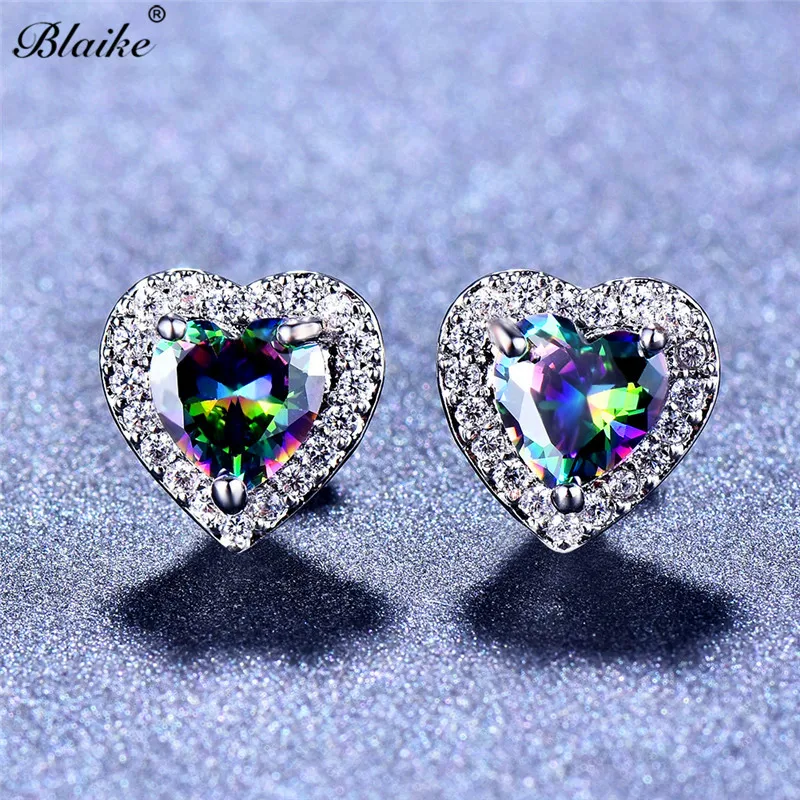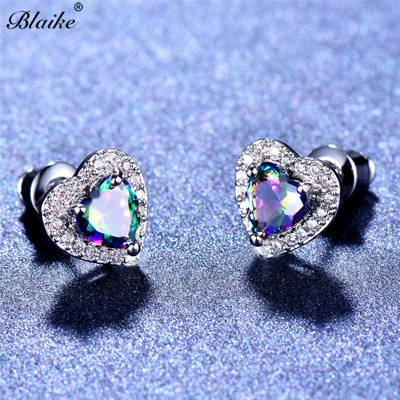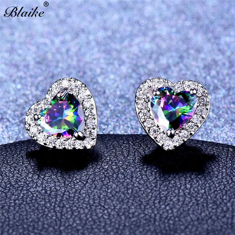 Cute Heart Mystic Fire Multicolor Zircon Stud Earrings for Women 925 Sterling Silver Filled Rainbow Birthstone Earrings