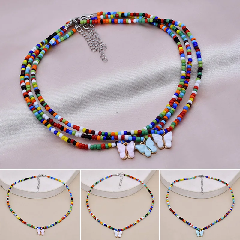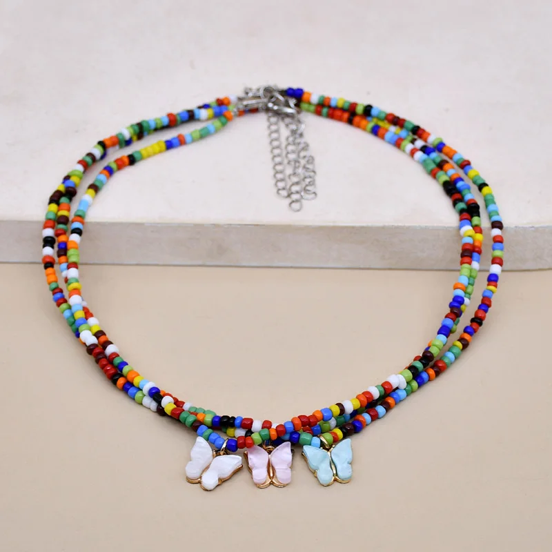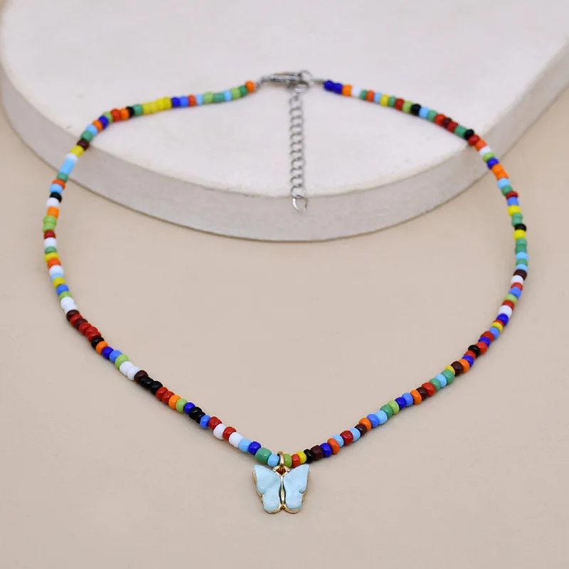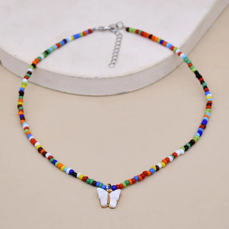 Bohemia Beads Choker Female Colorful Candy Neaklace With Butterfly Pendant Circle Lariat Bead Clavicle Chain Collar Jewelry Girl