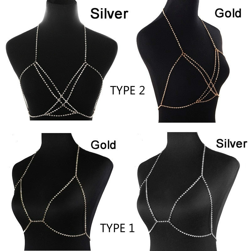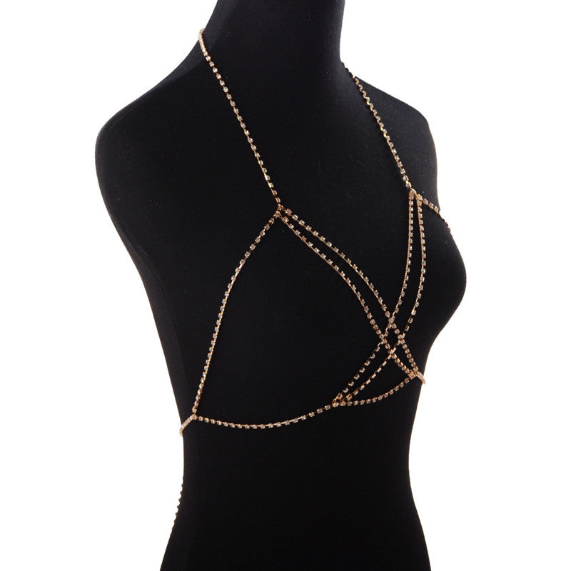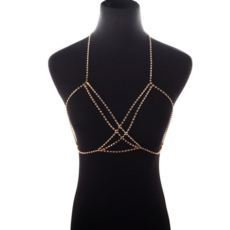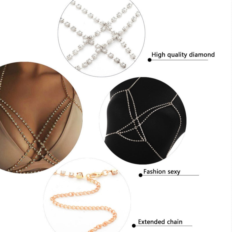 Bohemian Beach Sexy Chest Chain for Women Full Rhinestone Cross Chest Chain Shining Crystal Bra Body Necklace Choker Jewelry