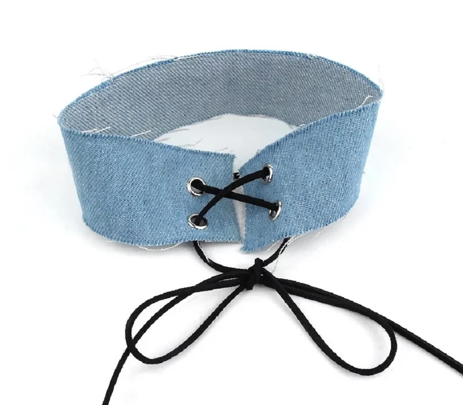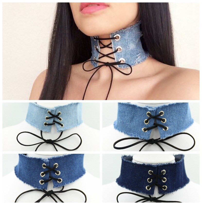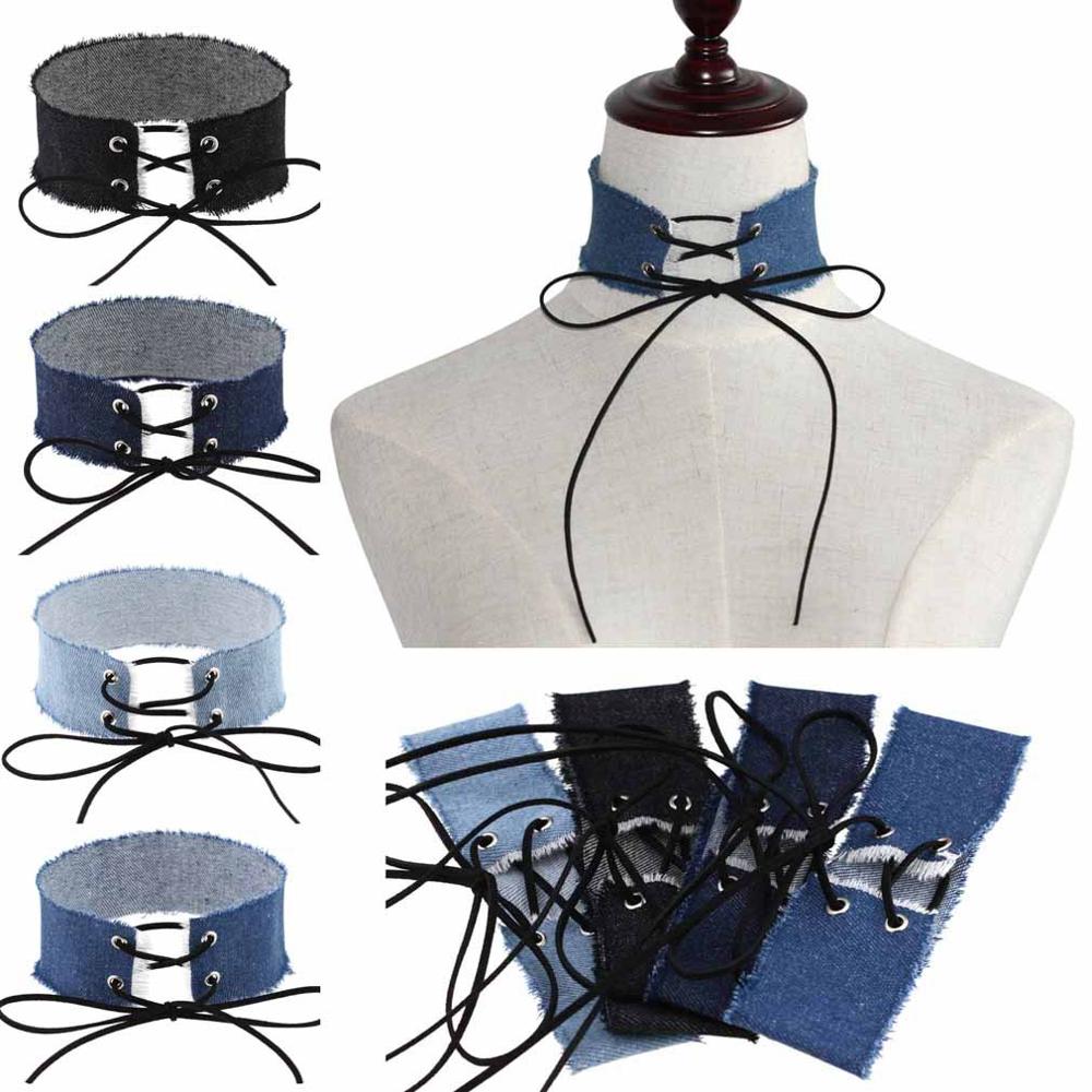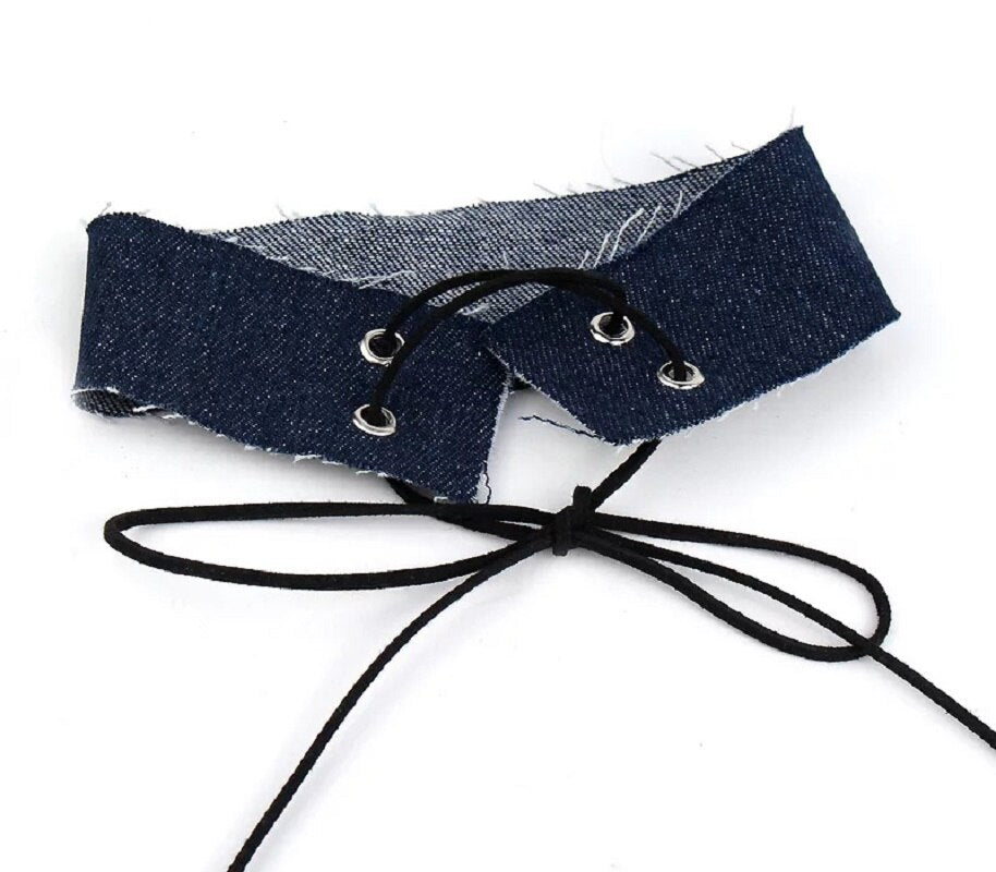Bohemian handmade lace up bow tassel denim Necklace retro Necklace women's punk wide denim neckline high neck
