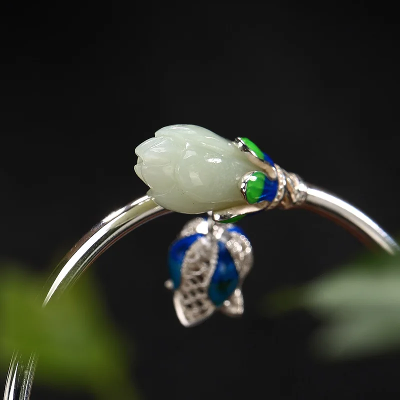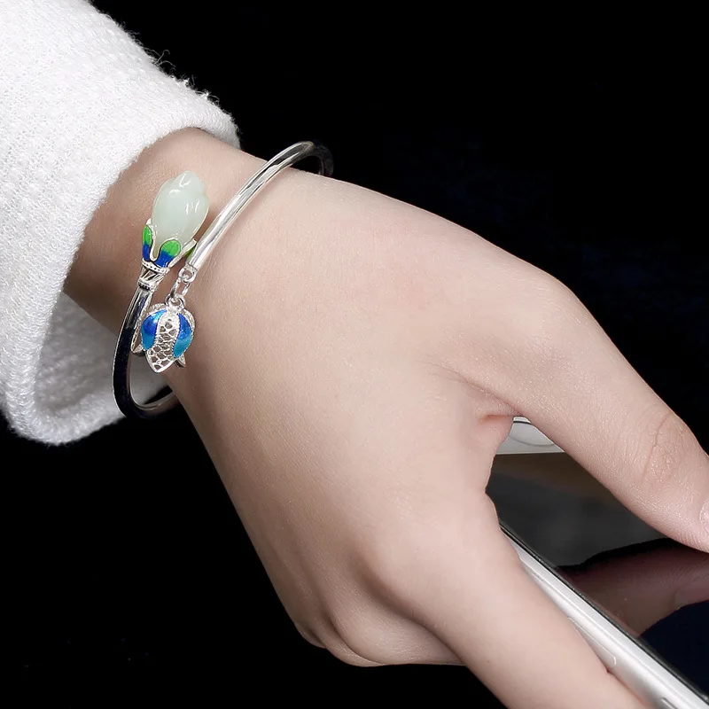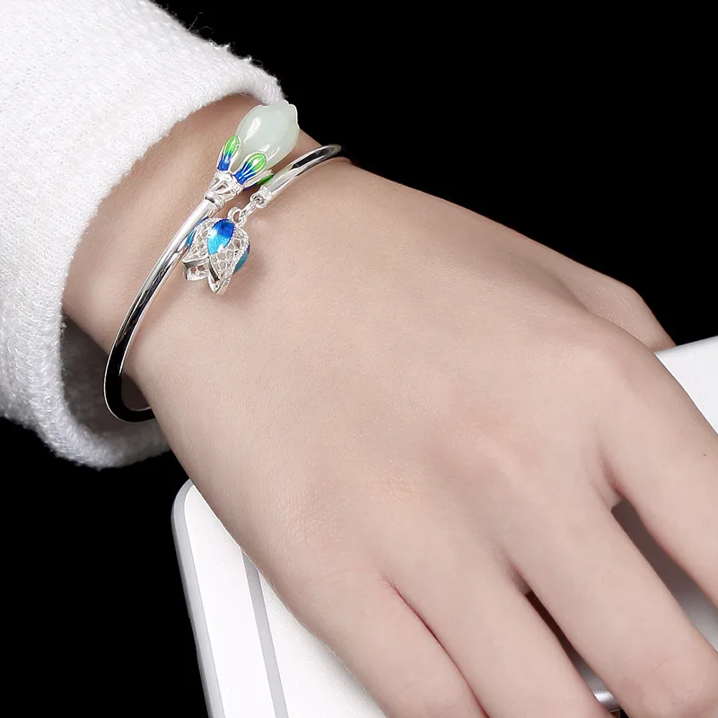 Bracelets & Bangles Authentic Silver 925 Jewelry Natural Jade Engraved Magnolia Flower Cloisonne Enamel Process Openning Type