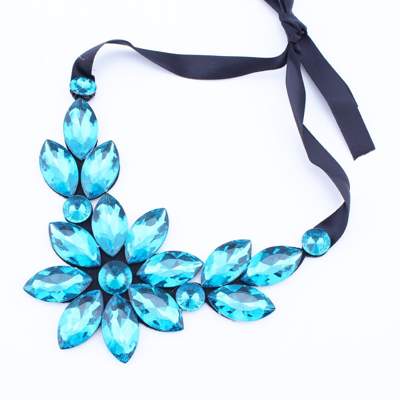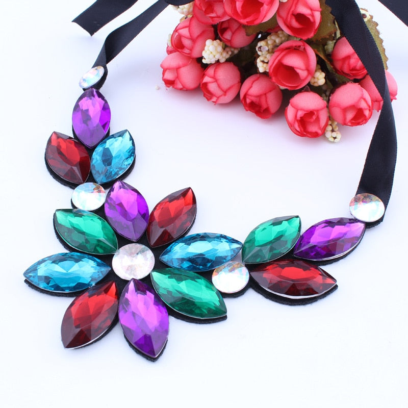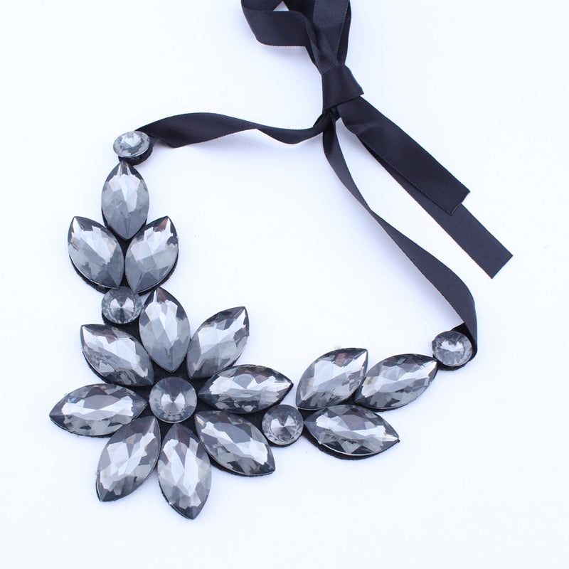 Brand Rhinestone Gem Crystal Big Flowers Choker Necklaces Statement Maxi Necklaces Black Ribbon Adjustable Collar Necklaces