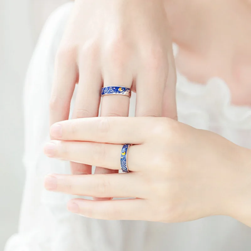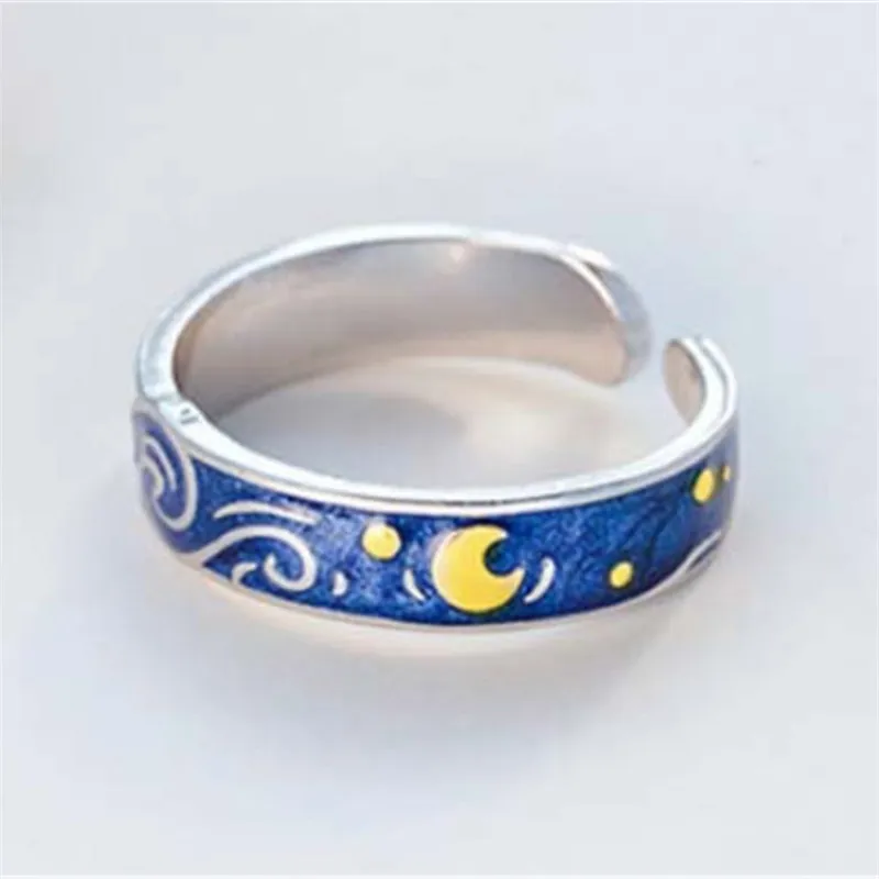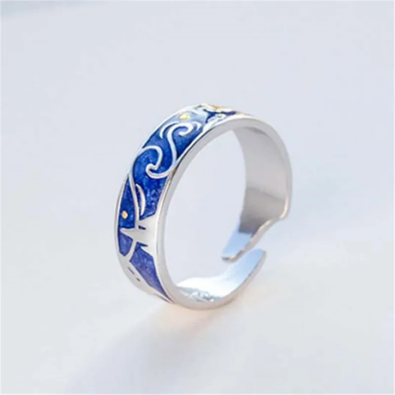Brand Van Gogh Night Open Rings For Women Men Simple Design Silver Color Lovers Blue Starry Sky Ring Party Jewelry A946