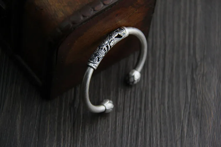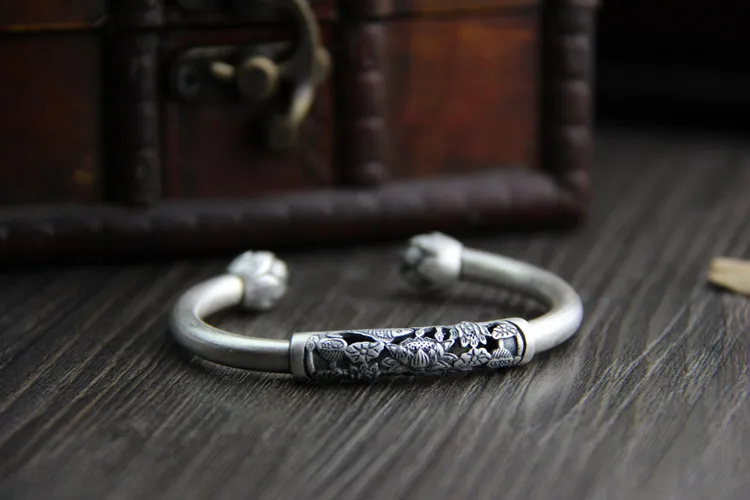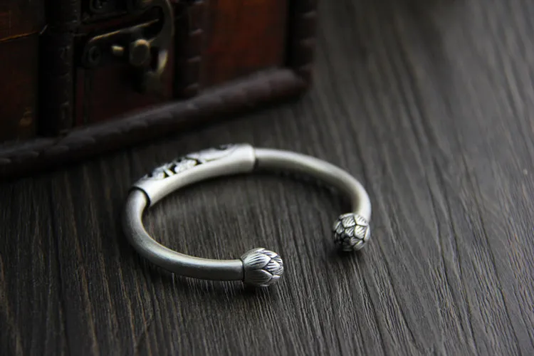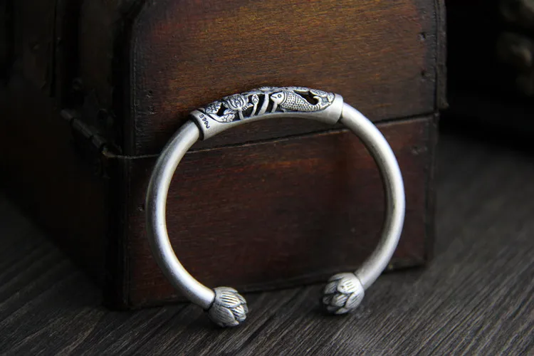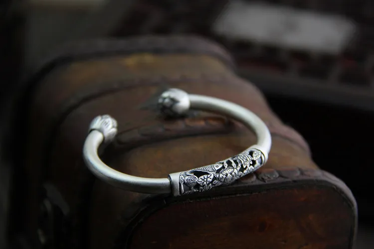 C&R Real 990 Sterling Silver bangles for women fish lotus bracelet Thai silver retro Ethnic style Fine Jewelry Adjustable