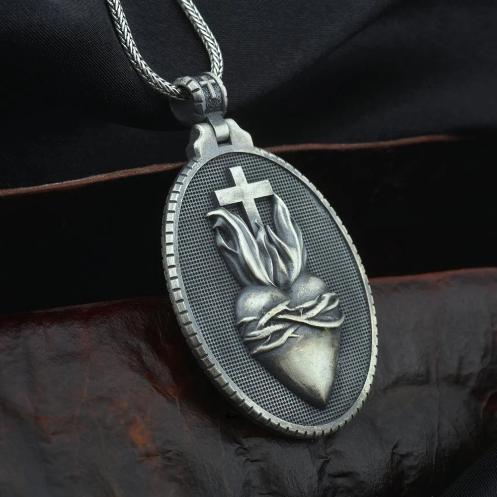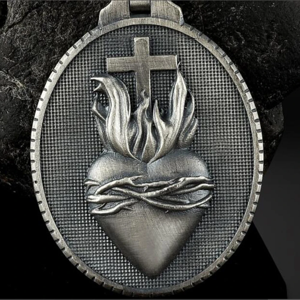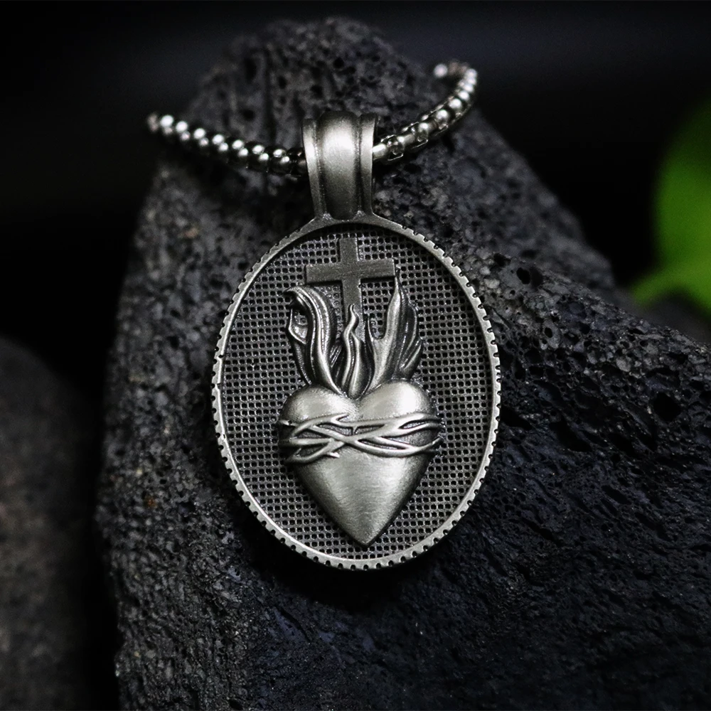 Christian Jesus Sacred Heart Medal Round Cross Pendant Necklace Men's Catholic Religious Pendant Chain Necklace