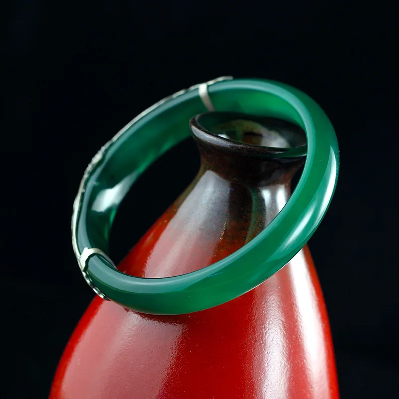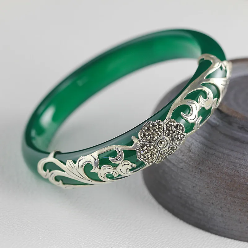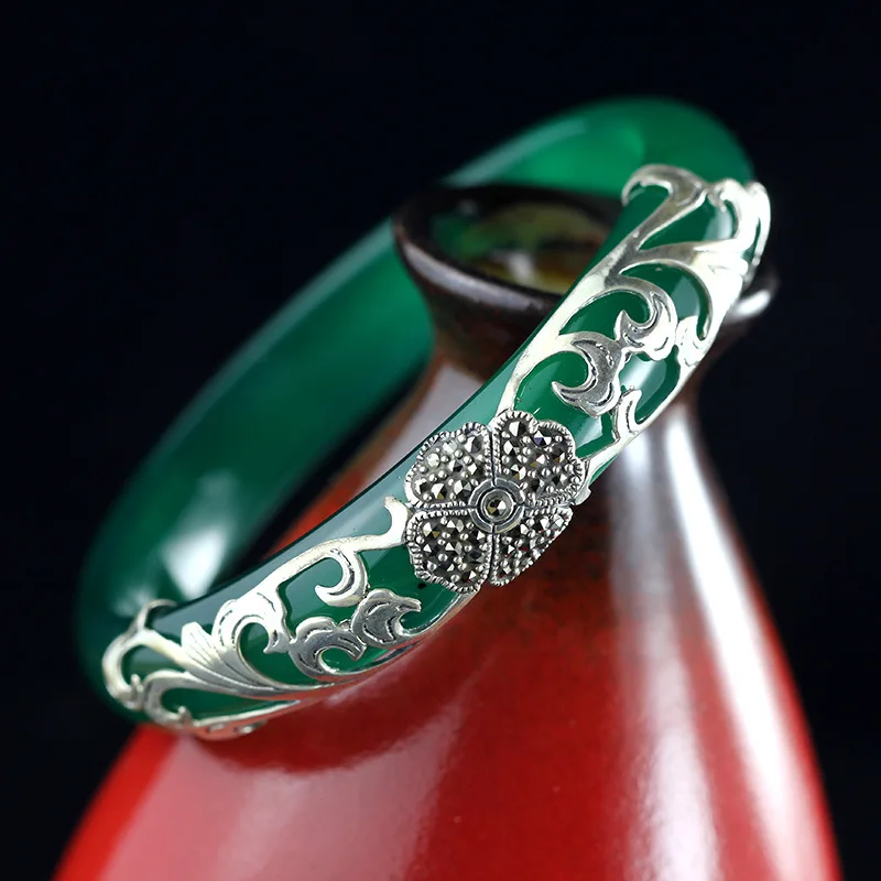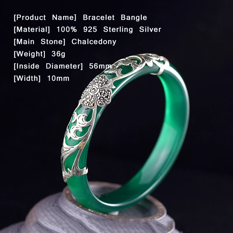 Classic 10mm Wide Green Chalcedony Bracelet For Women Vintage Clover Elegant Leaves Jewelry Real 925 Sterling Thai Silver Bangle