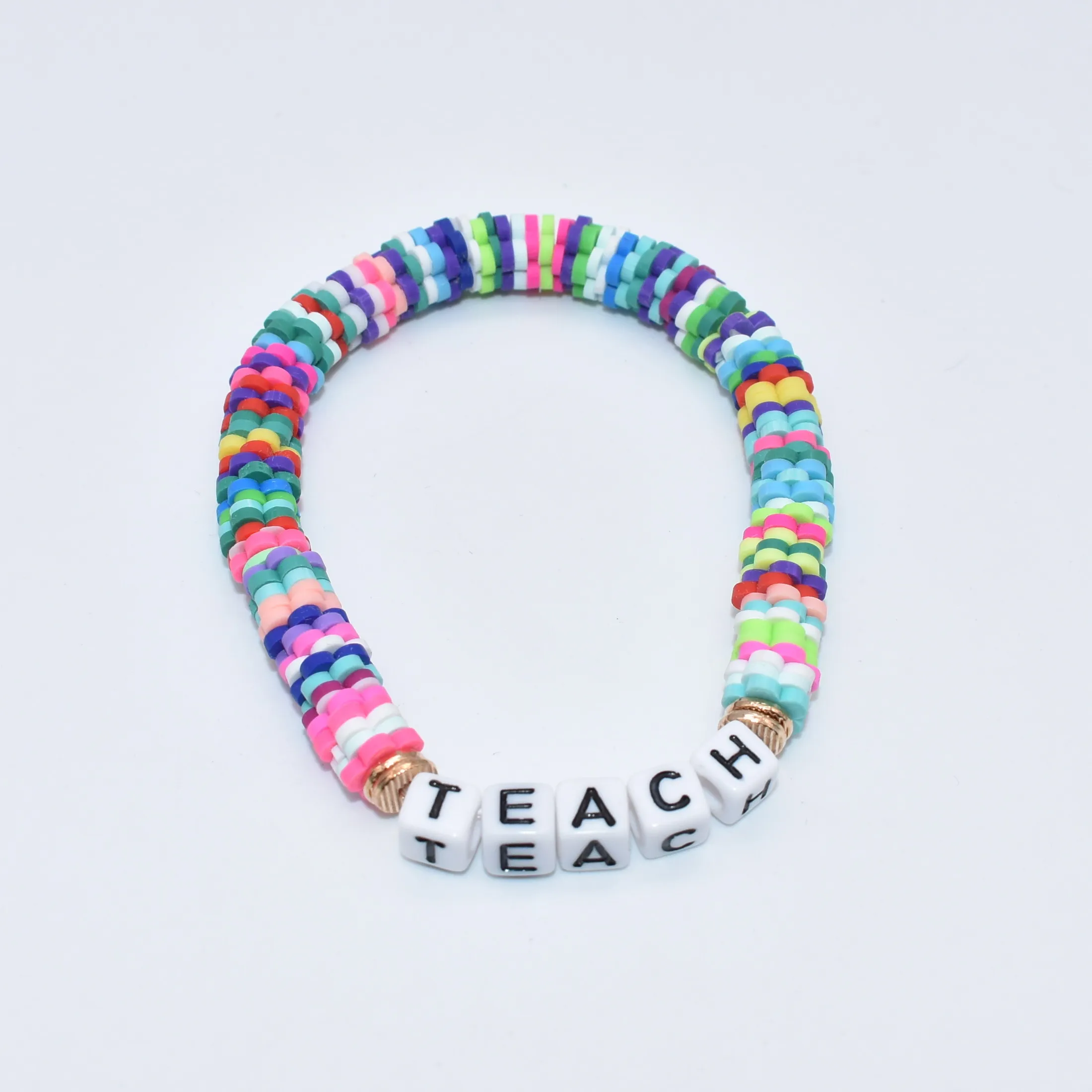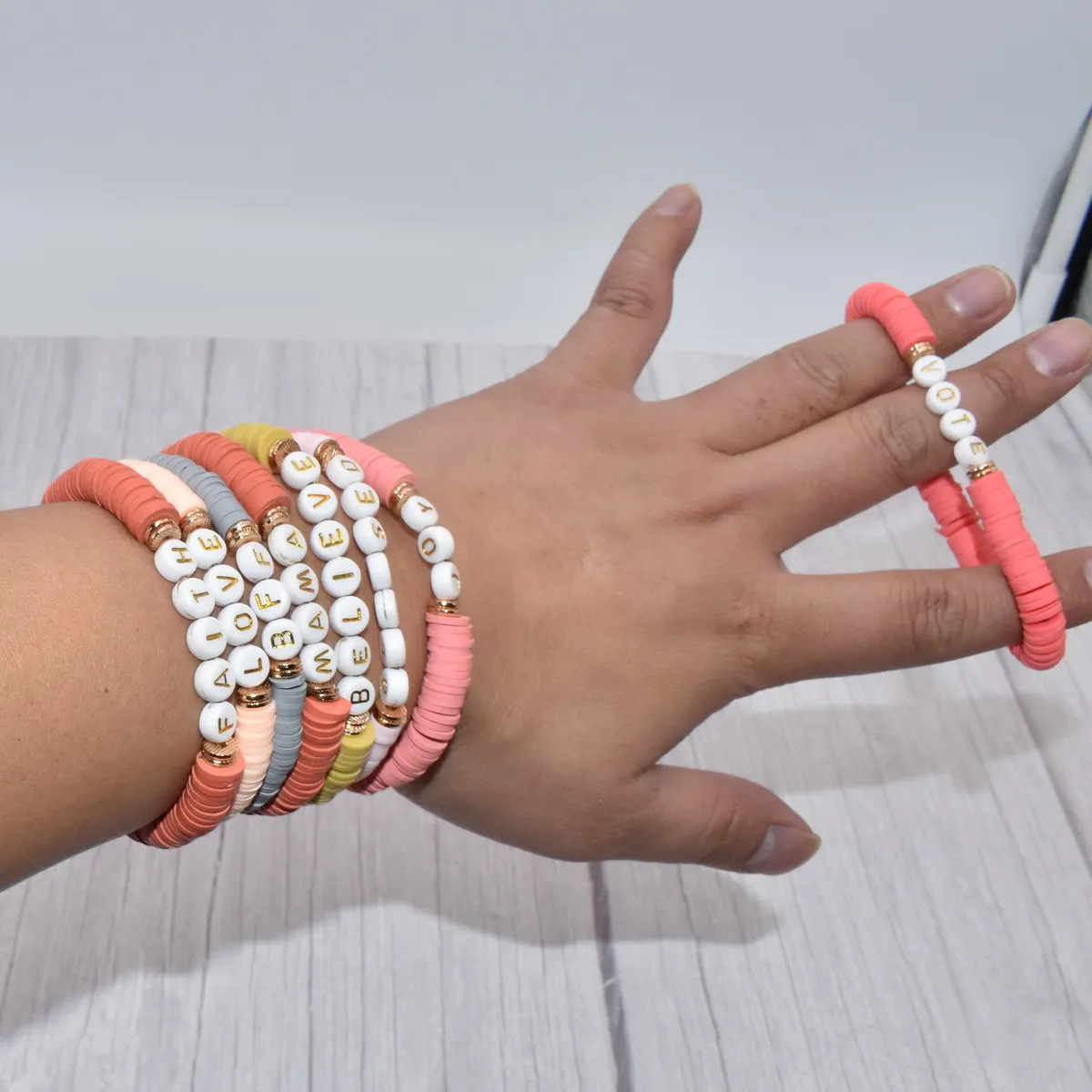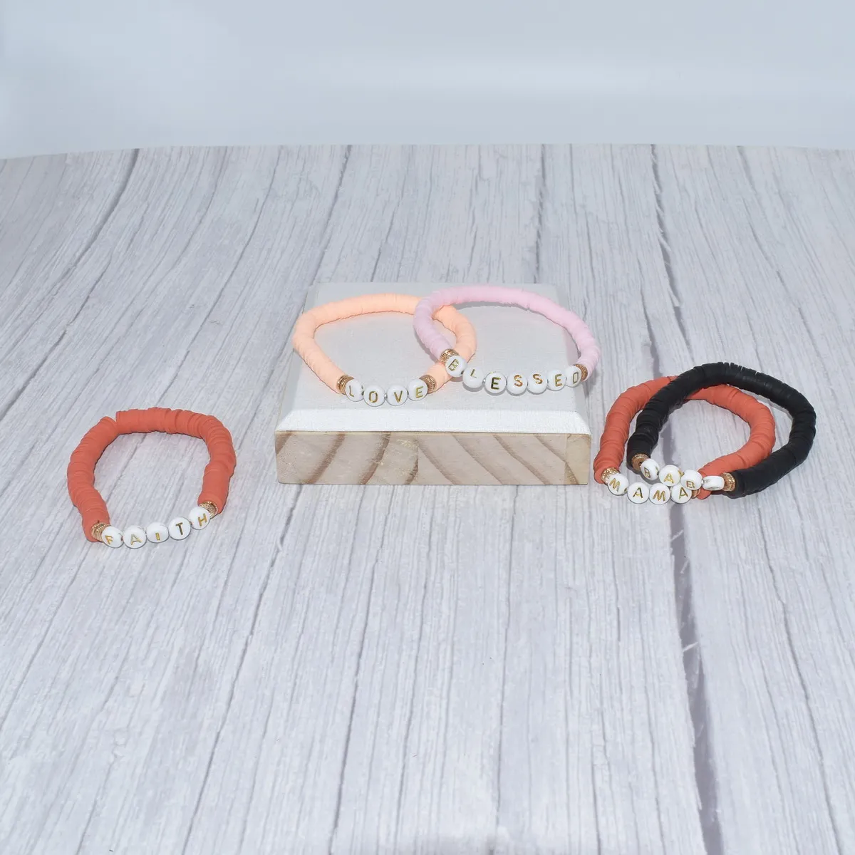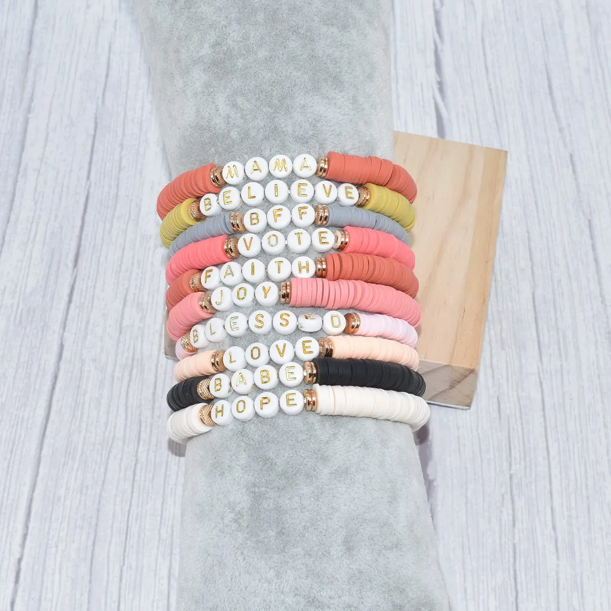 Colorful Polymer Clay Disc Brush Gold Zinc Alloy Metal Spacers Words FAITH BREATHE MAMA BELIEVE stretch Bracelet For Women